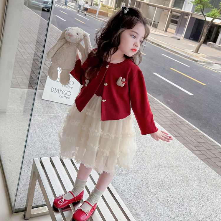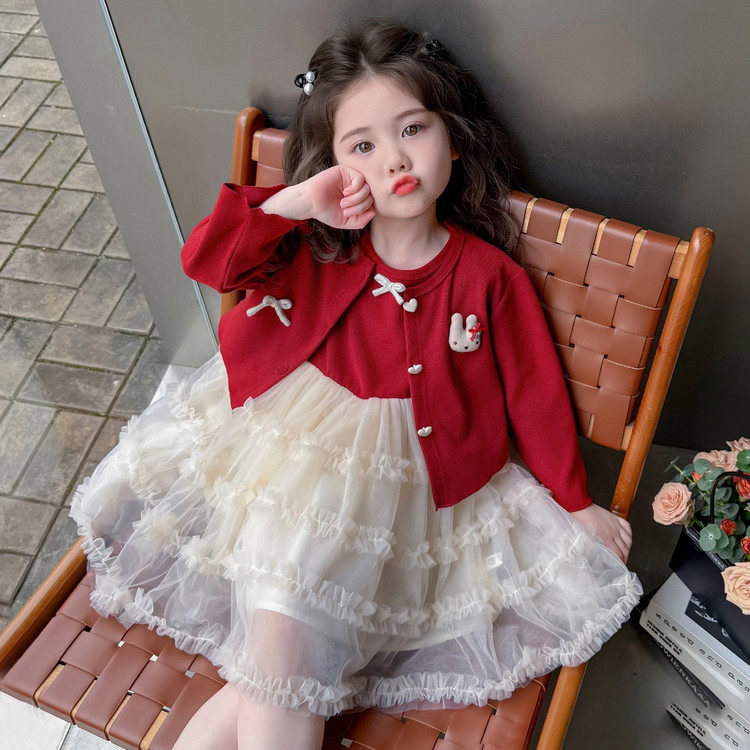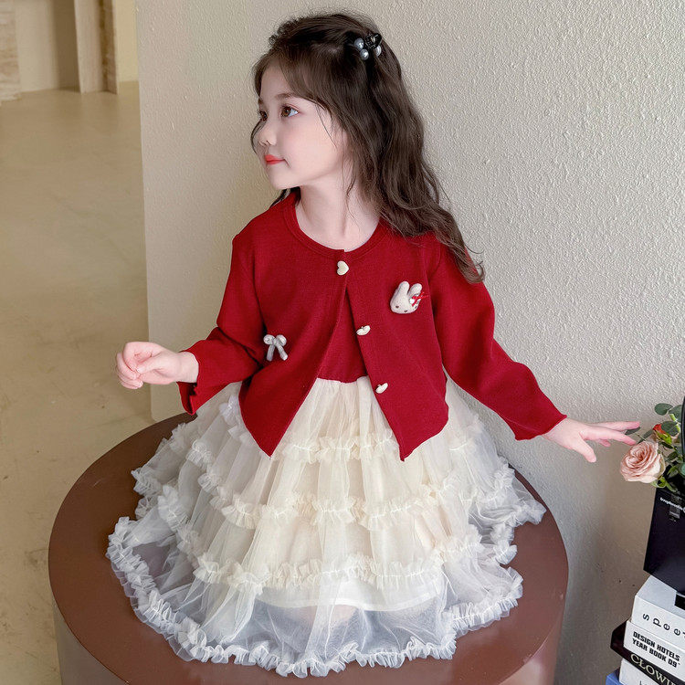 女童红色公主裙春秋新款网纱蛋糕裙两件套洋气甜美风连衣裙