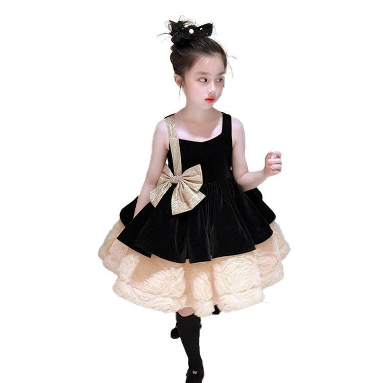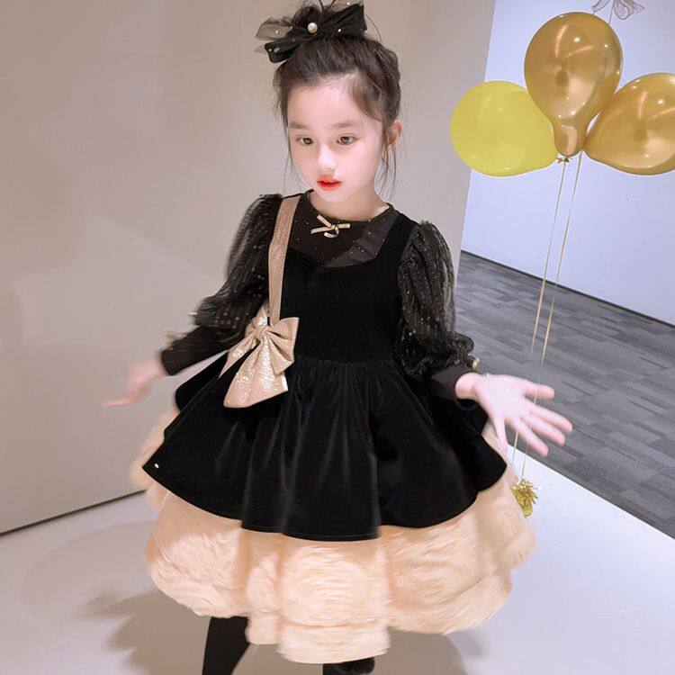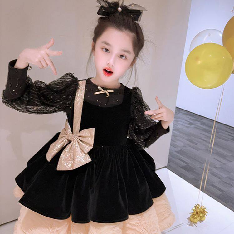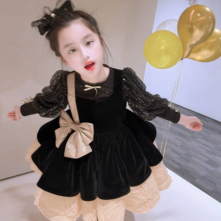 女童公主裙秋冬加绒黑色蕾丝泡泡袖蝴蝶结连衣裙小女孩礼服裙