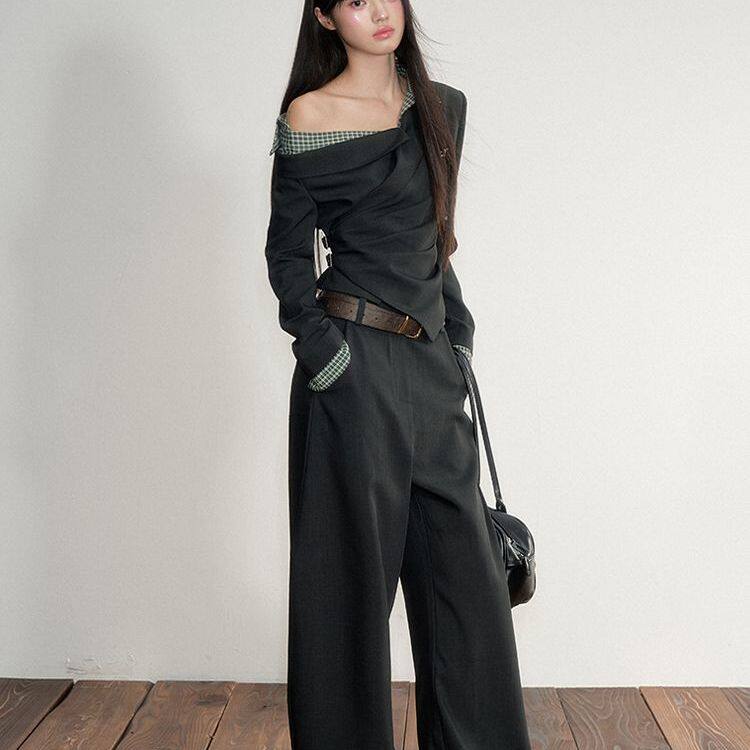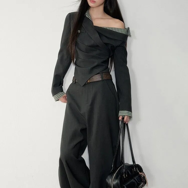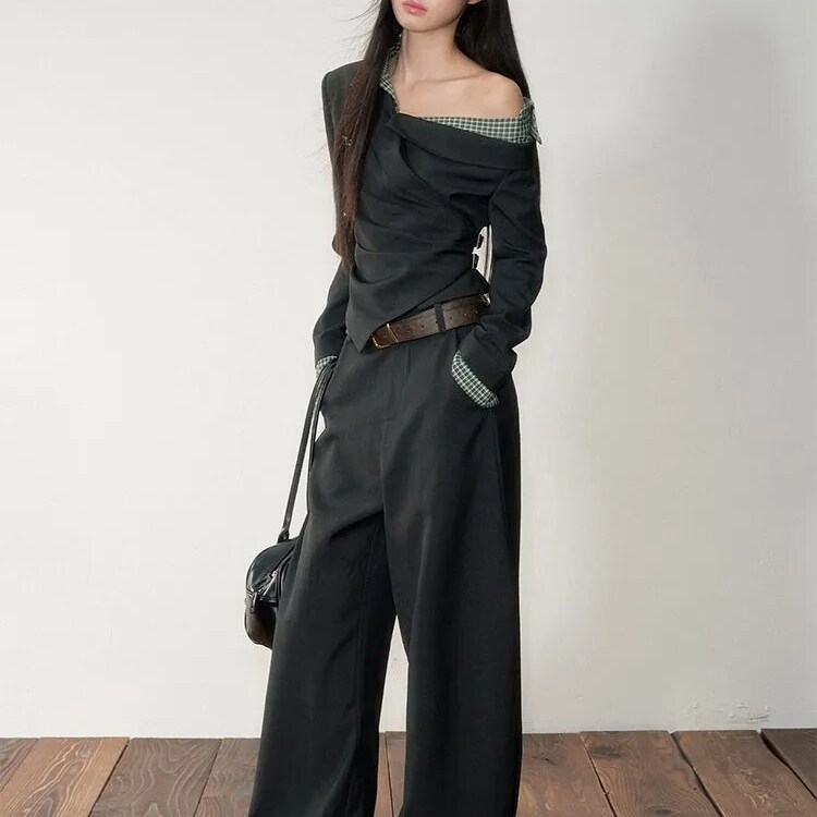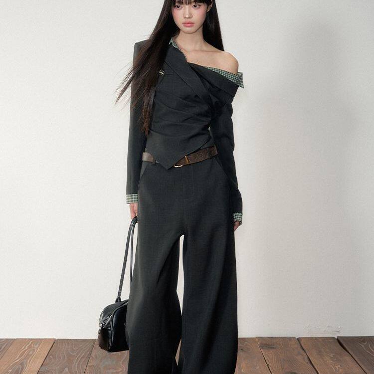 【韩系少女】韩系复古格子拼接假两件收腰斜肩上衣+西装裤两件套