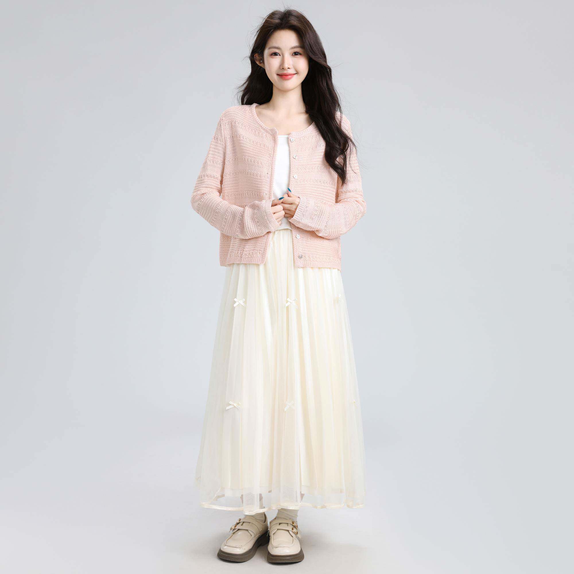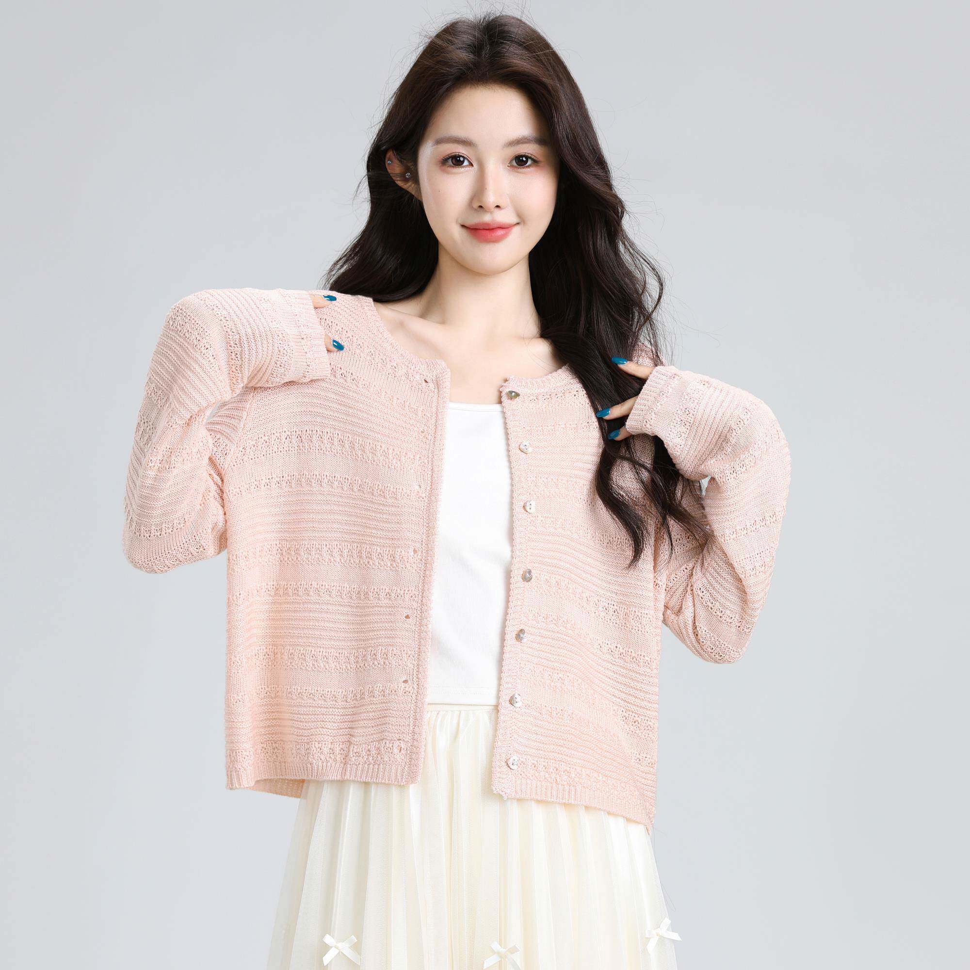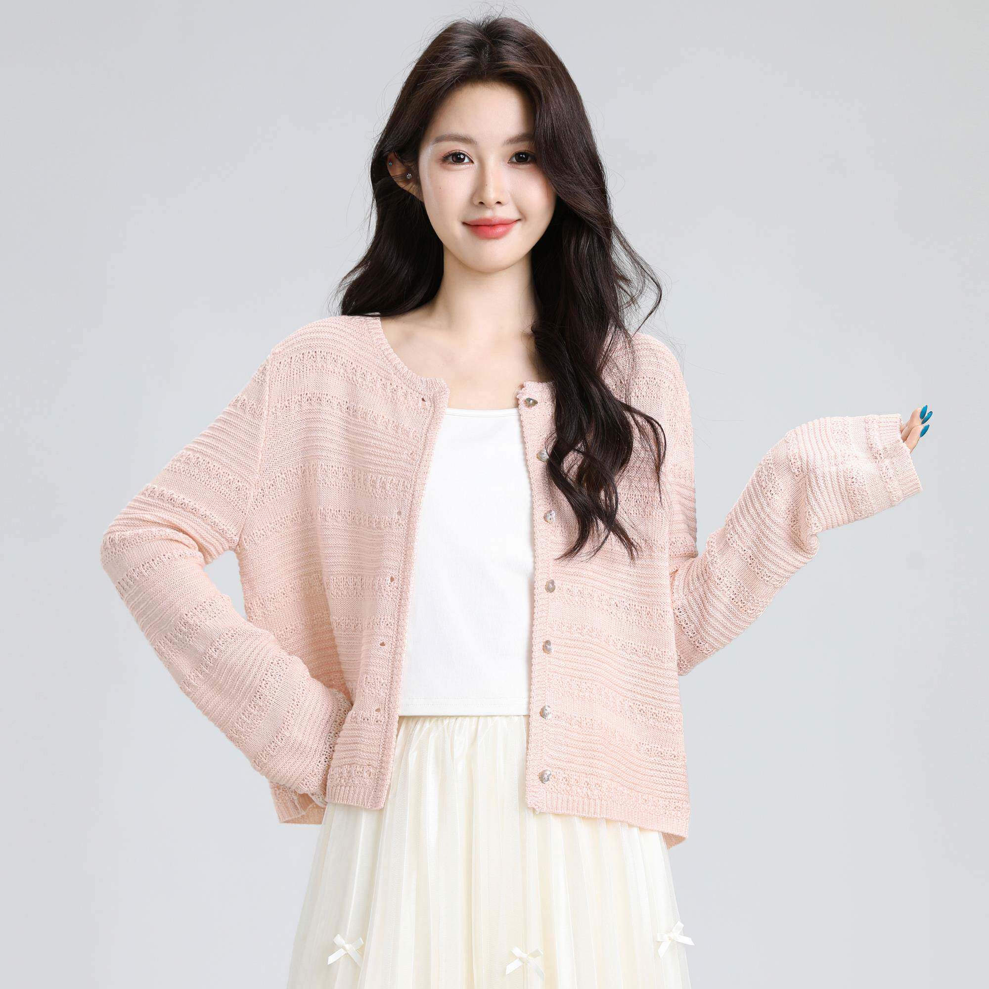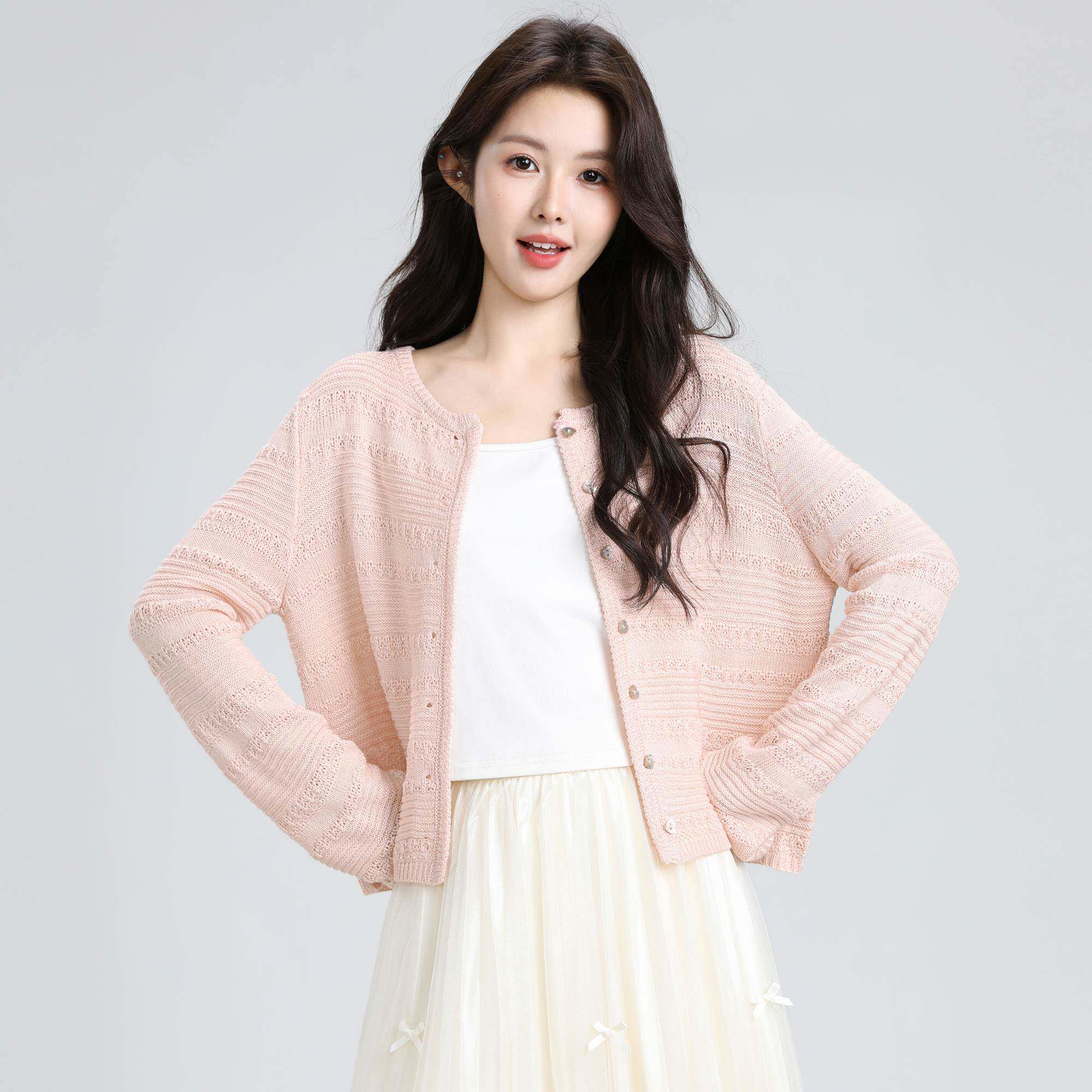 浅粉色圆领针织开衫女春2025春秋新款镂空设计感薄款外套短款上衣