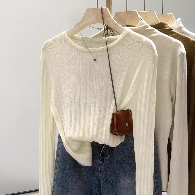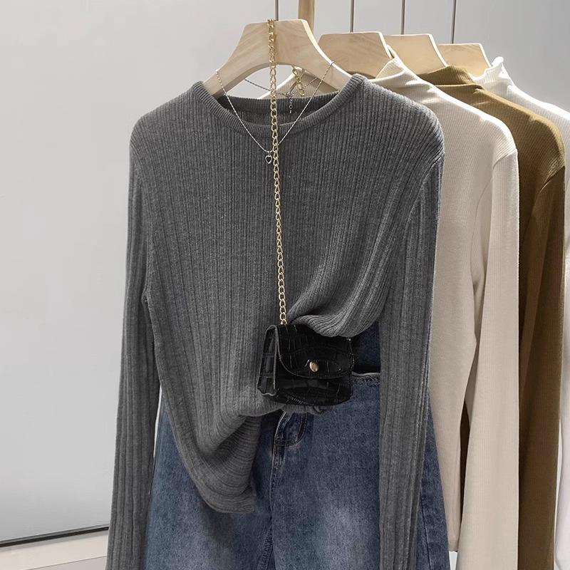 韩系圆领套头正肩长袖针织衫女秋冬修身气质内搭打底衫高级感上衣