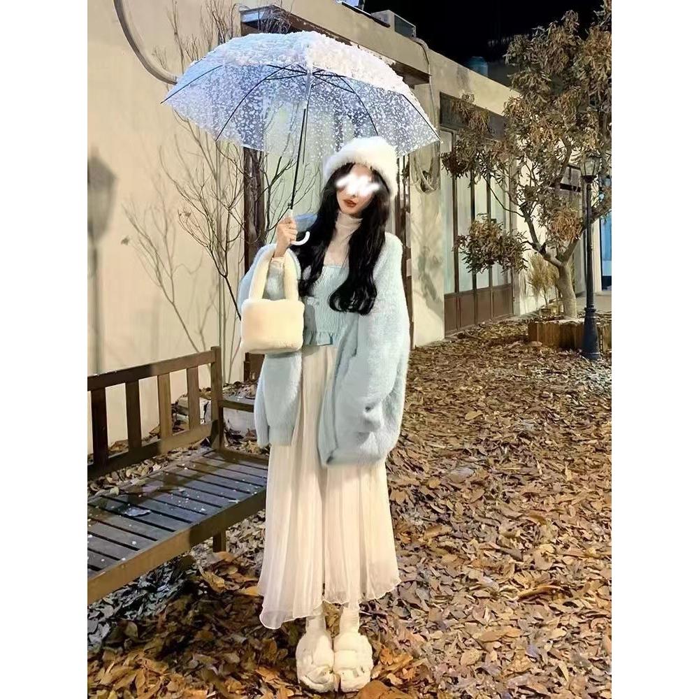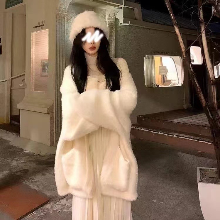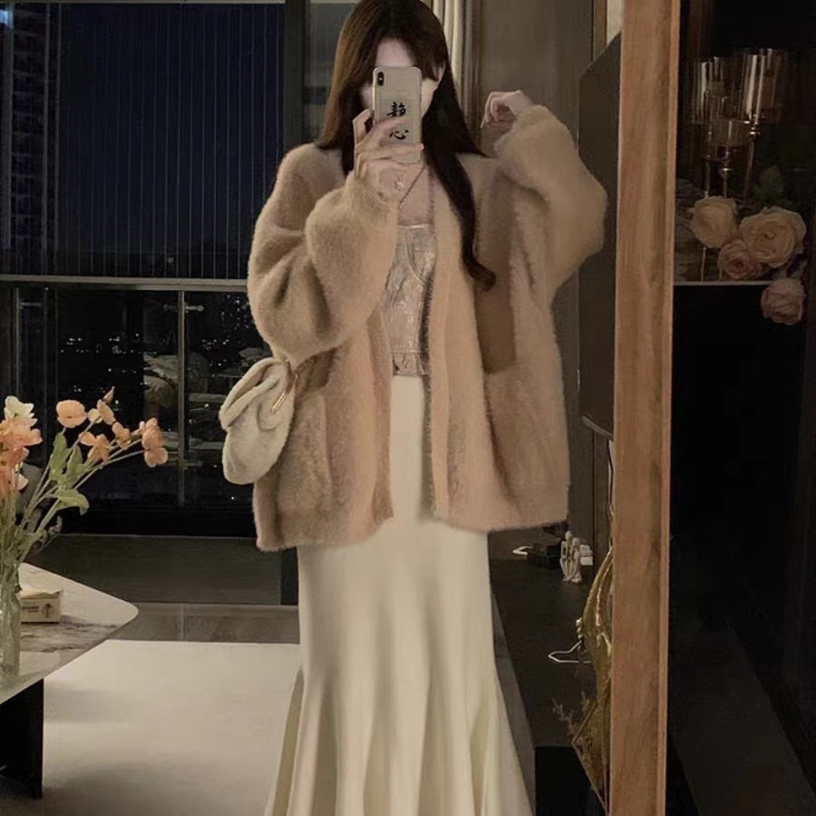 韩系奶fufu慵懒水貂绒毛衣外套女秋冬加厚粉色毛绒软糯针织开衫AP