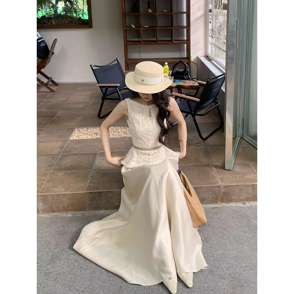 木子李的李锦绣华章法式轻奢蕾丝无袖上衣显瘦半身裙套装