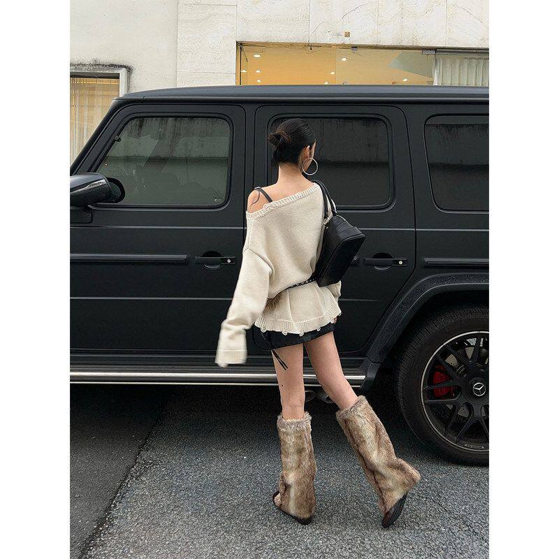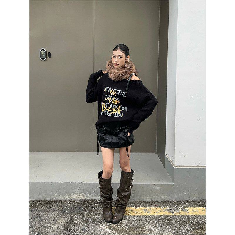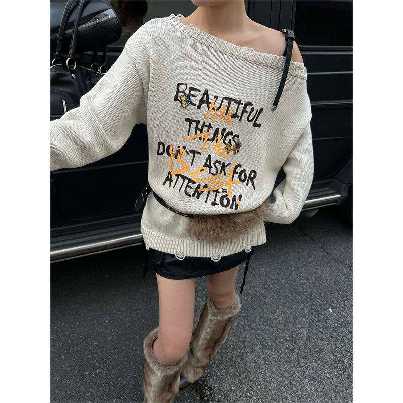 领冬季2025露肩下摆字母斜肩毛衣复古针织衫印花辣妹磨破风W1800