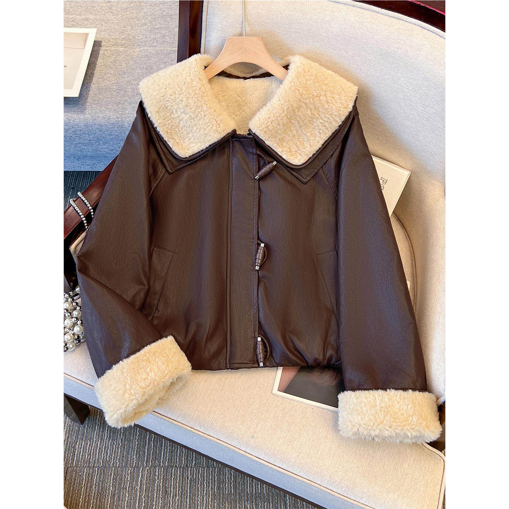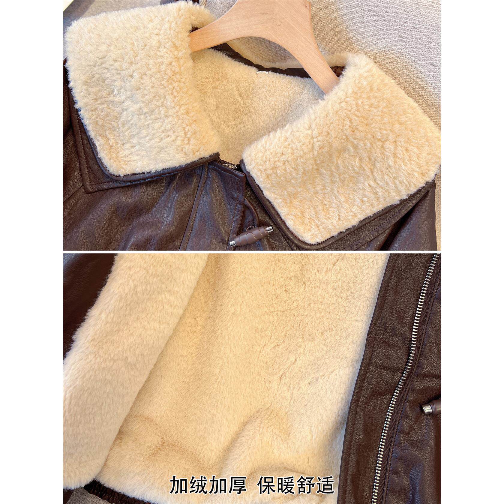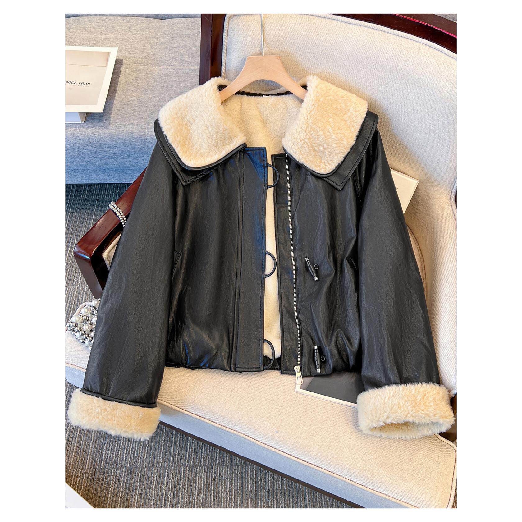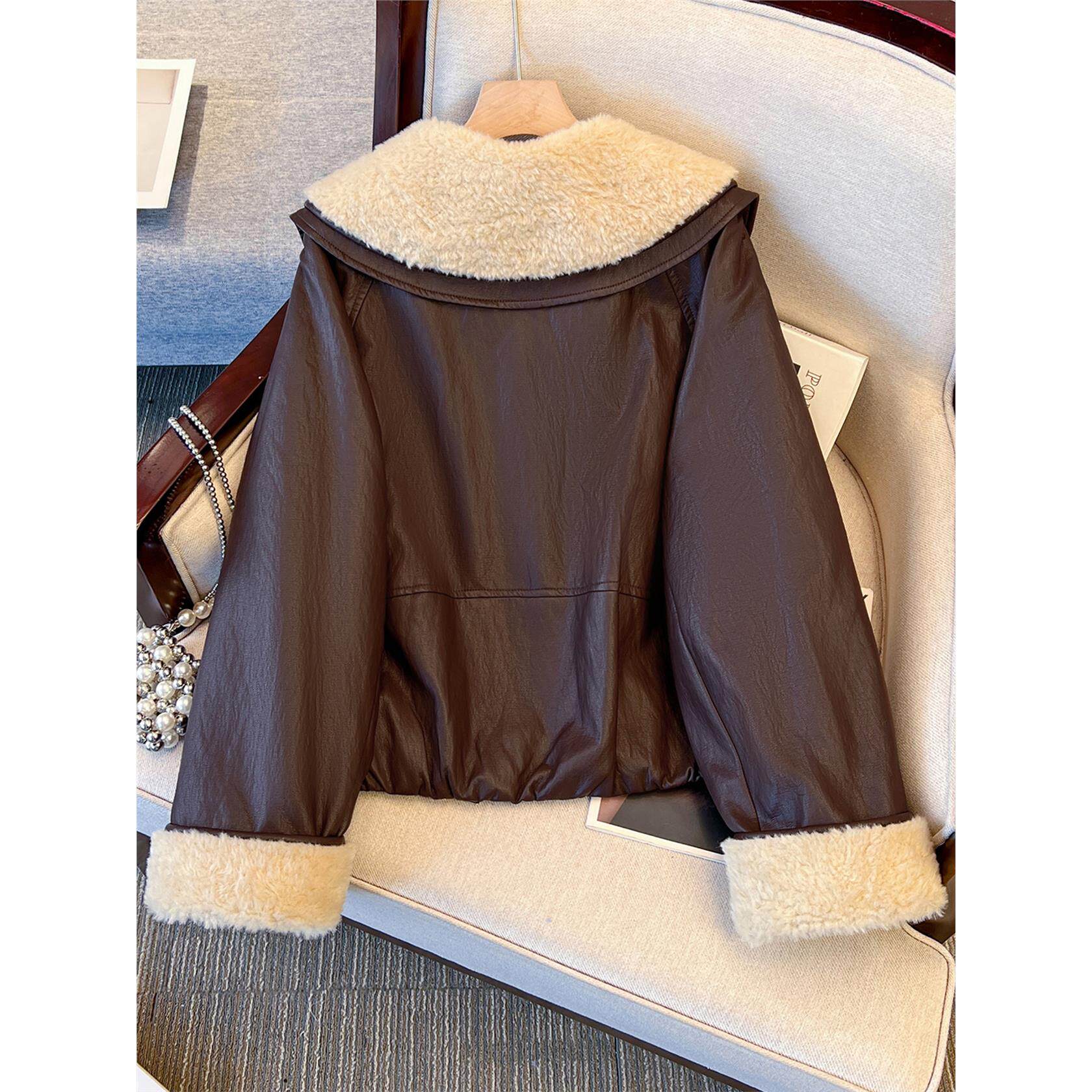 小香风羊羔毛娃娃大翻领pu皮衣外套女加绒加厚2025初冬装新款夹克