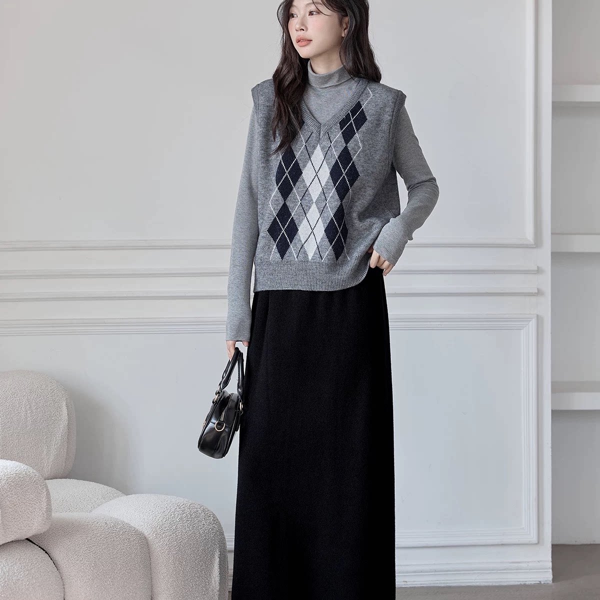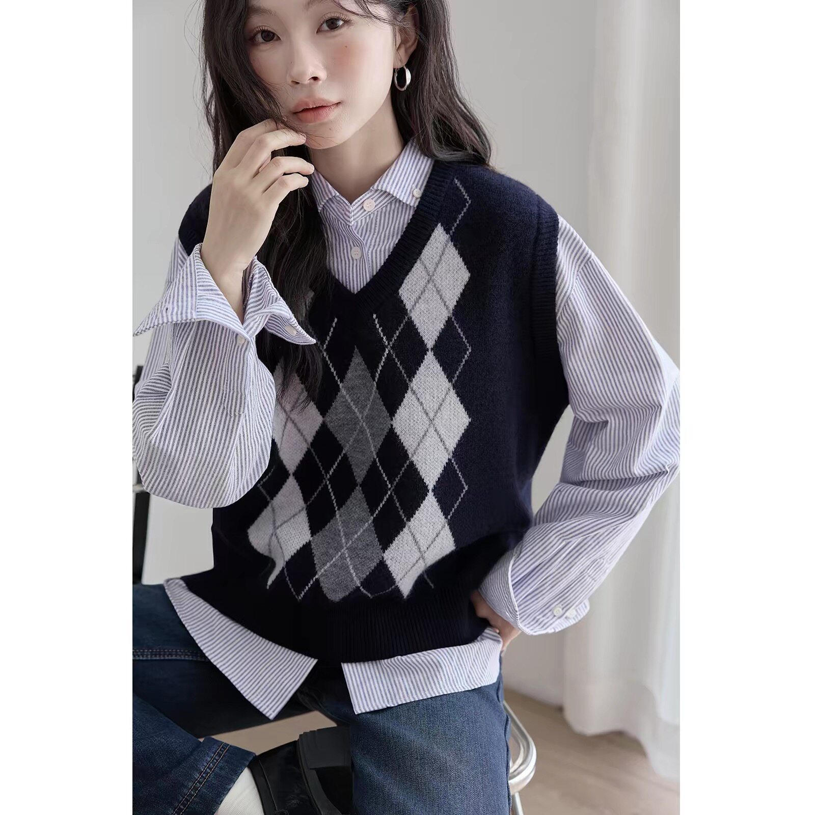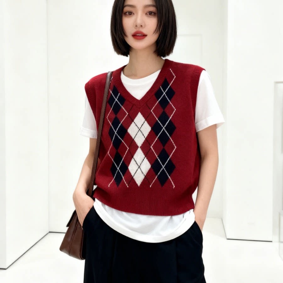包邮初春新款学院风短款菱格V领针织背心叠穿外搭马夹