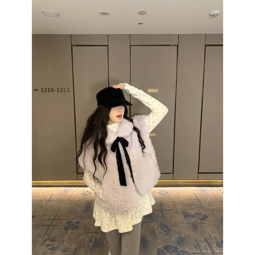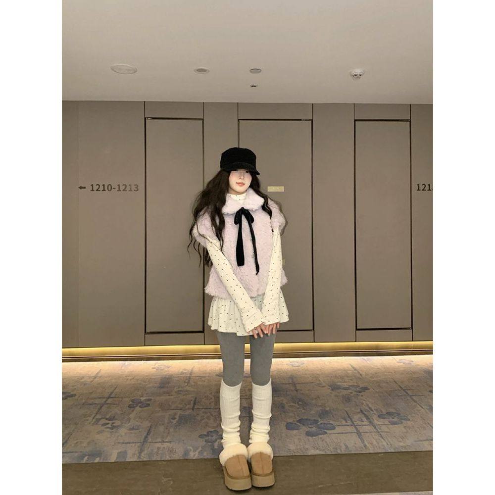 秋冬款韩系蝴蝶结新款甜美毛茸茸马甲外套波点打底上衣两件套套装