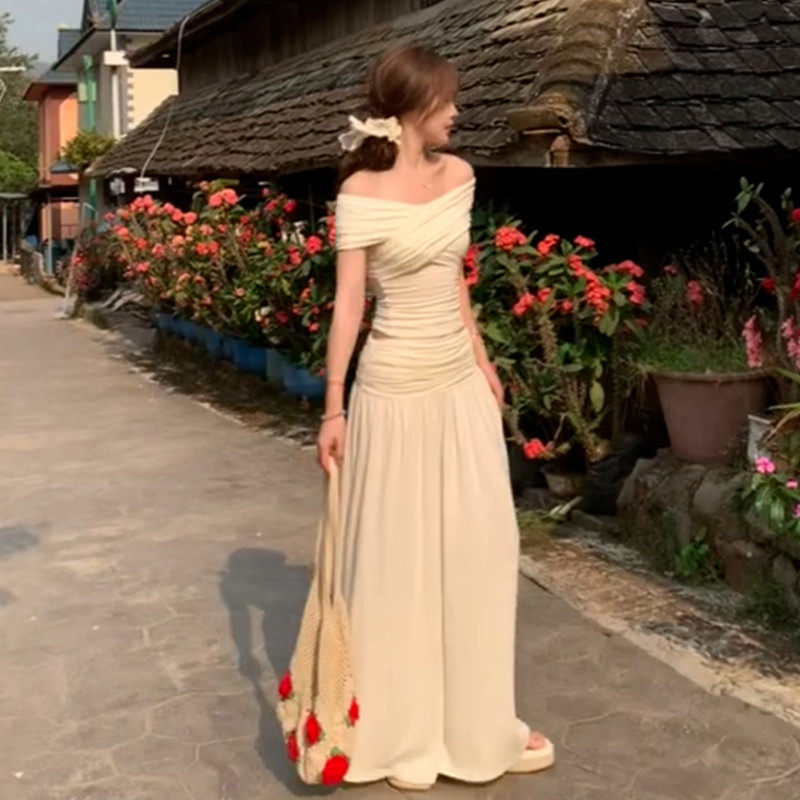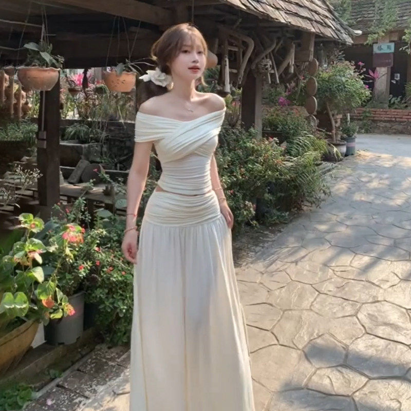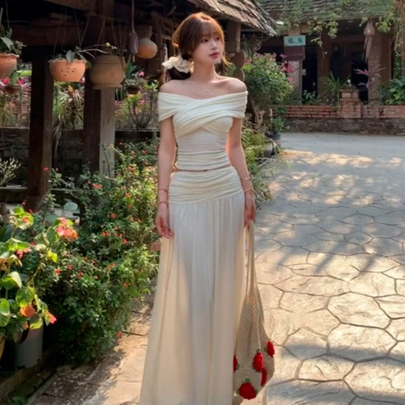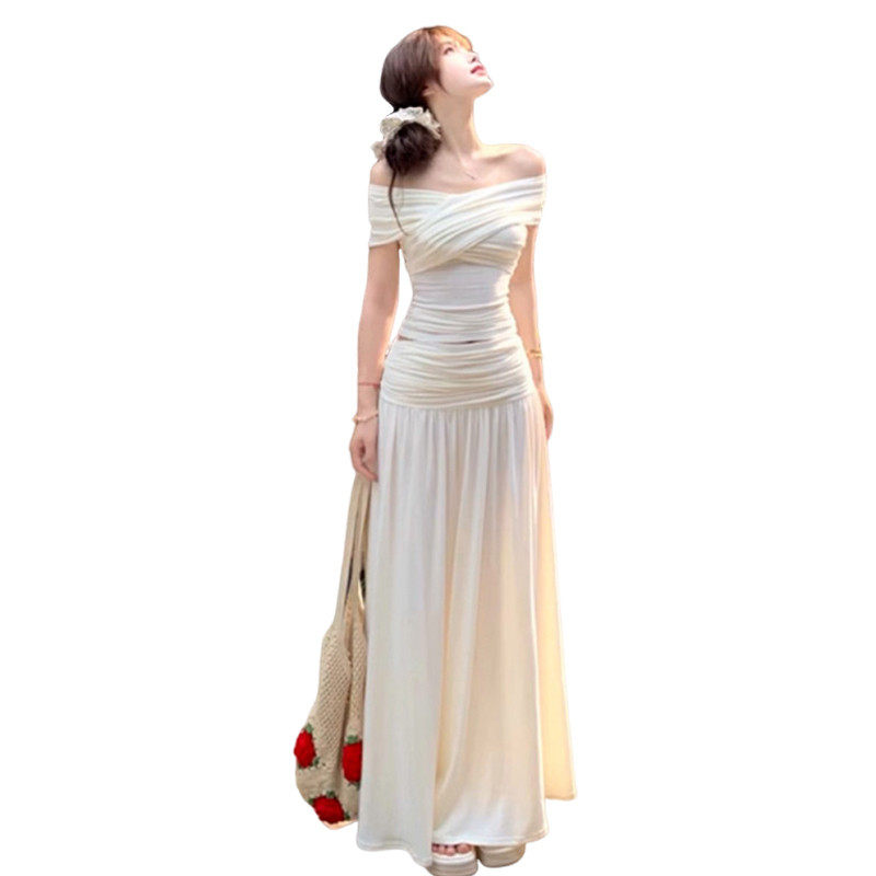 法式白色一字肩洋装子女2025新款初夏穿搭气质收腰掐腰长裙套装
