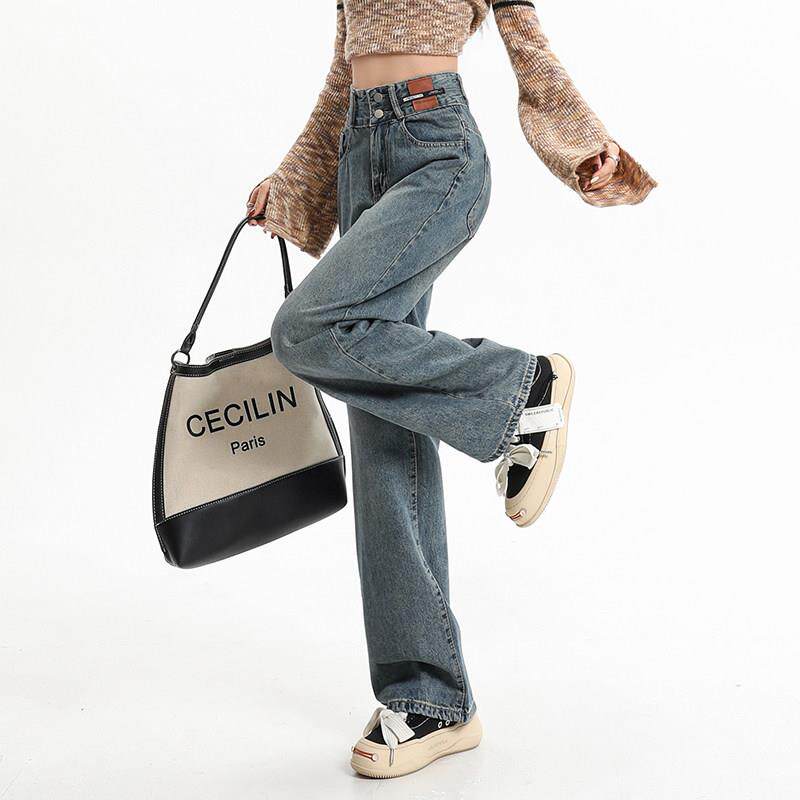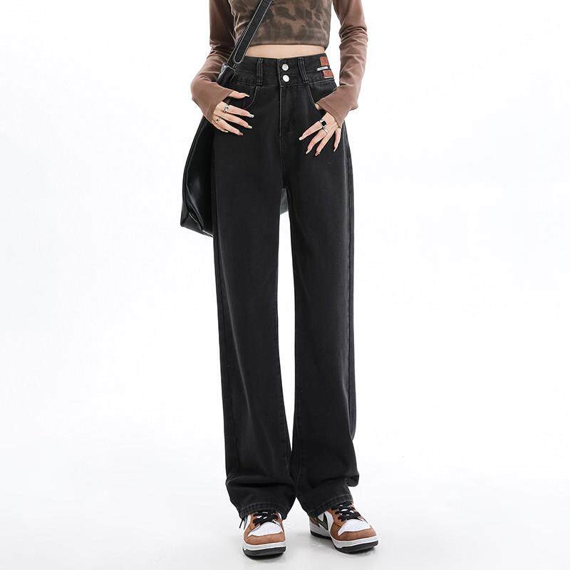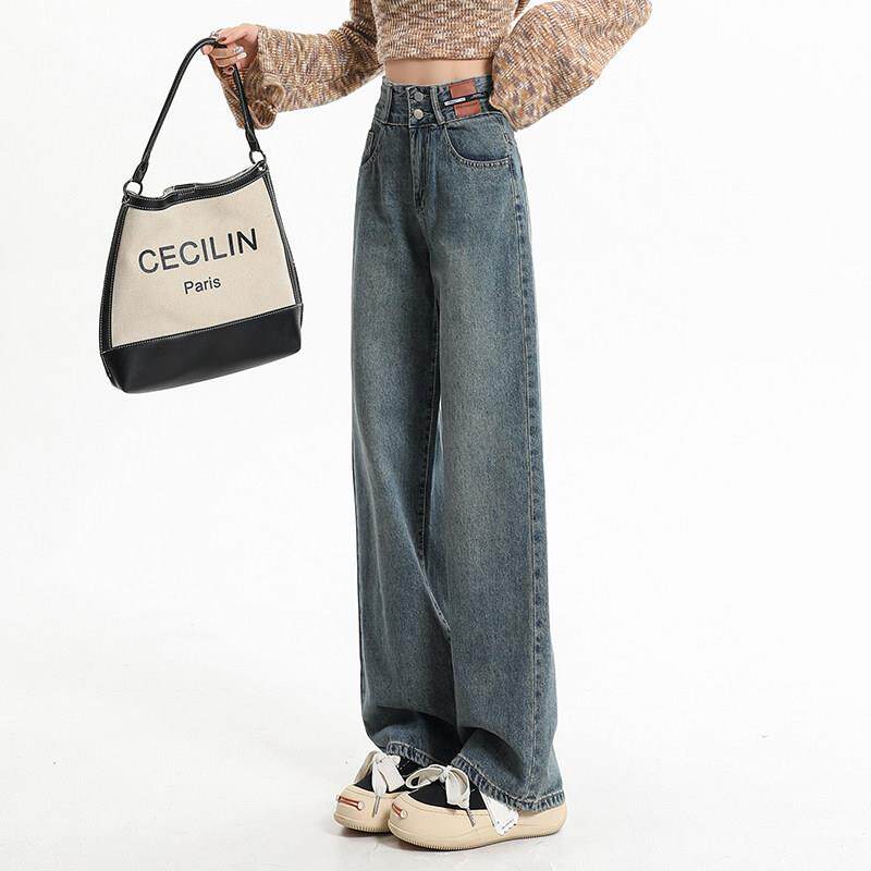 FPF美式复蓝古色直筒牛仔裤女新加绒高腿腰显瘦宽松垂款感百搭阔