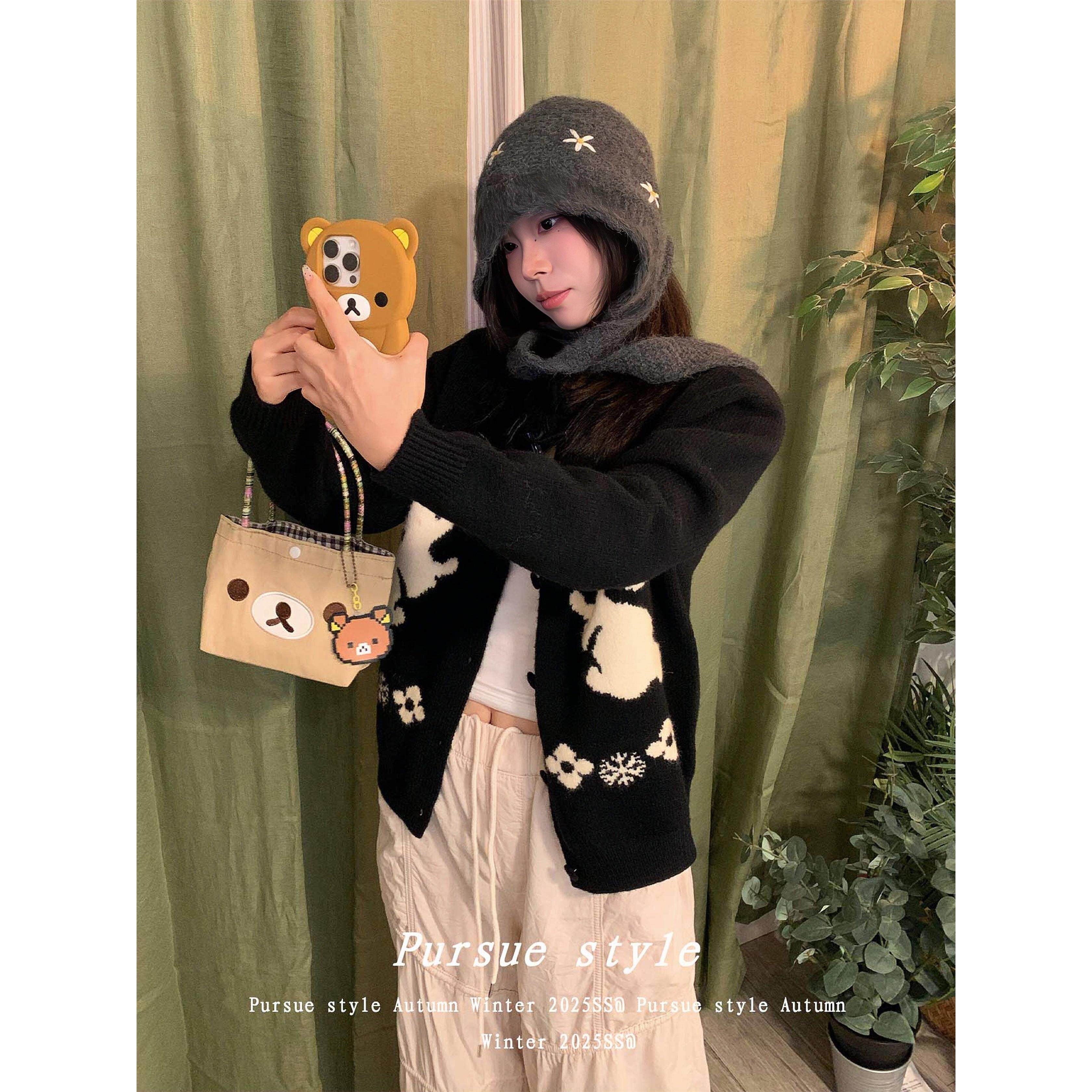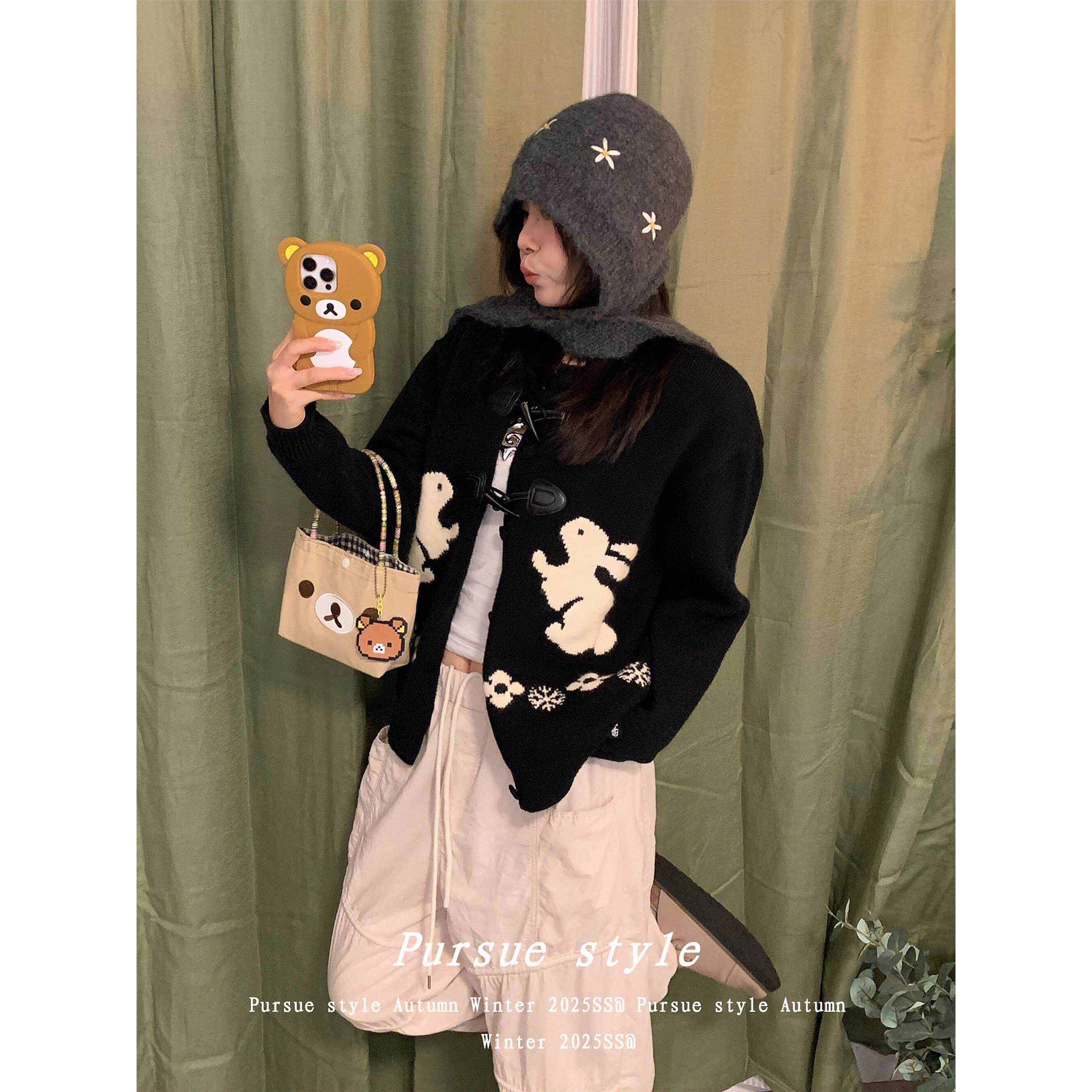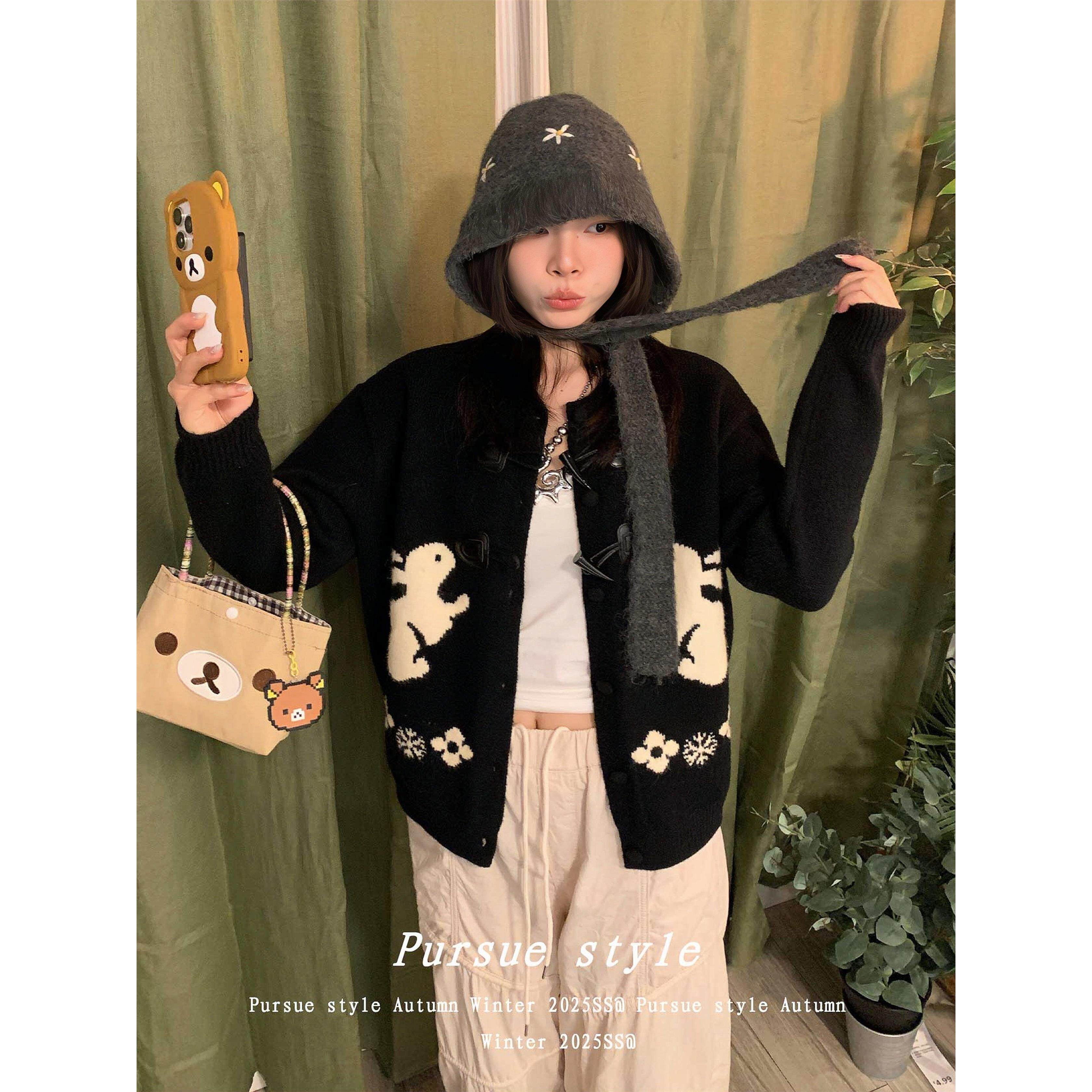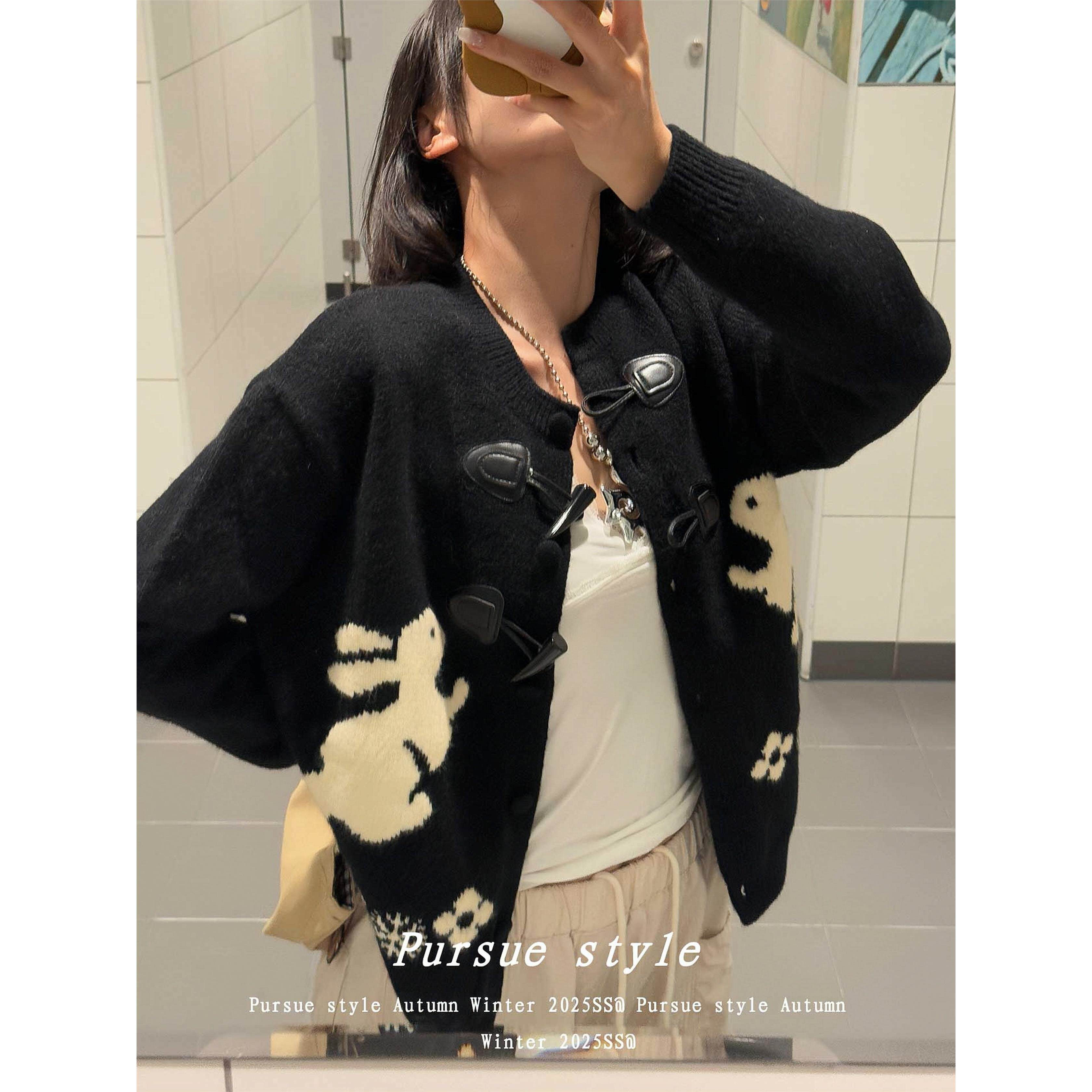 【永续黑码】慵懒风毛衣外套女秋季兔子绣花针织开衫牛角扣上衣潮