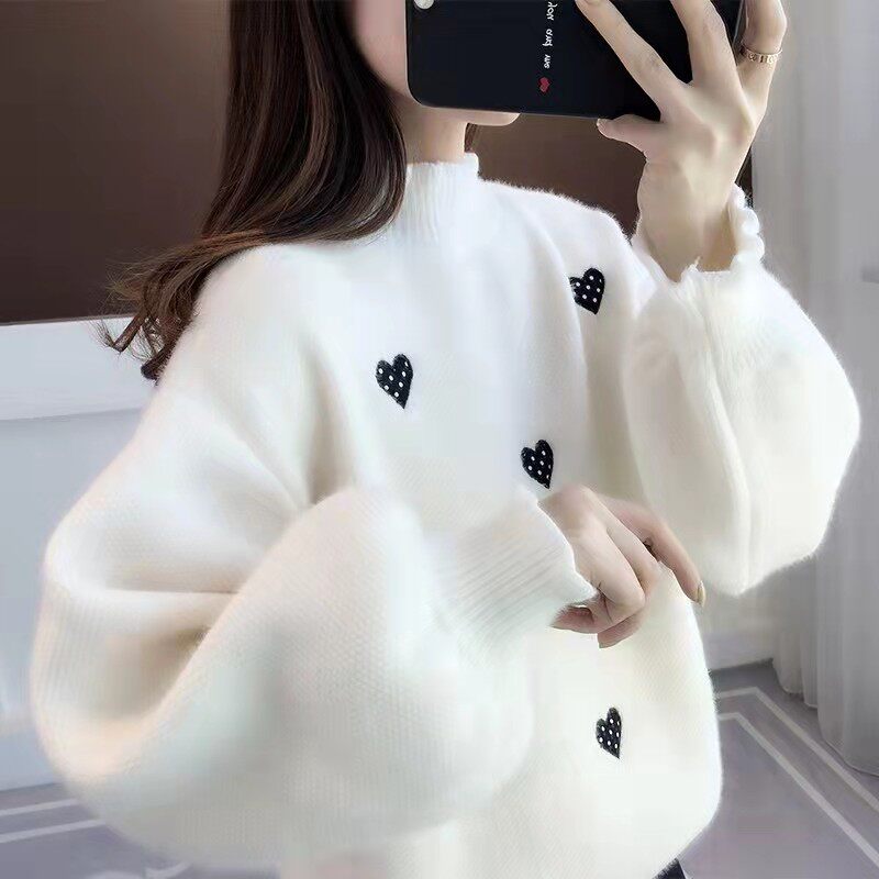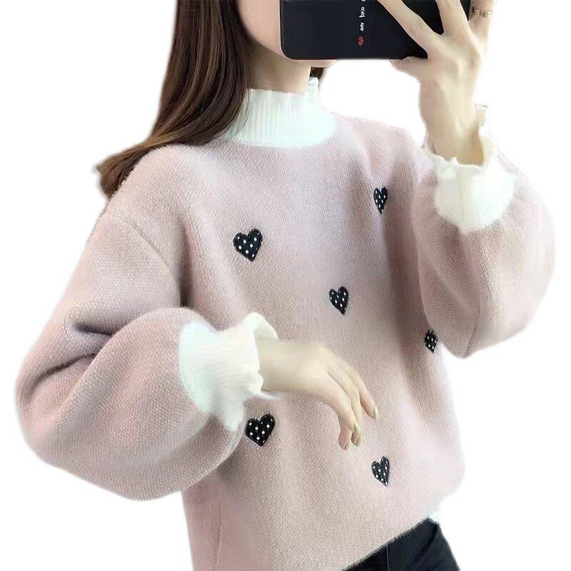 2025年秋冬季新款女毛衣宽松慵懒风半高领套头加厚加绒针织打底衫