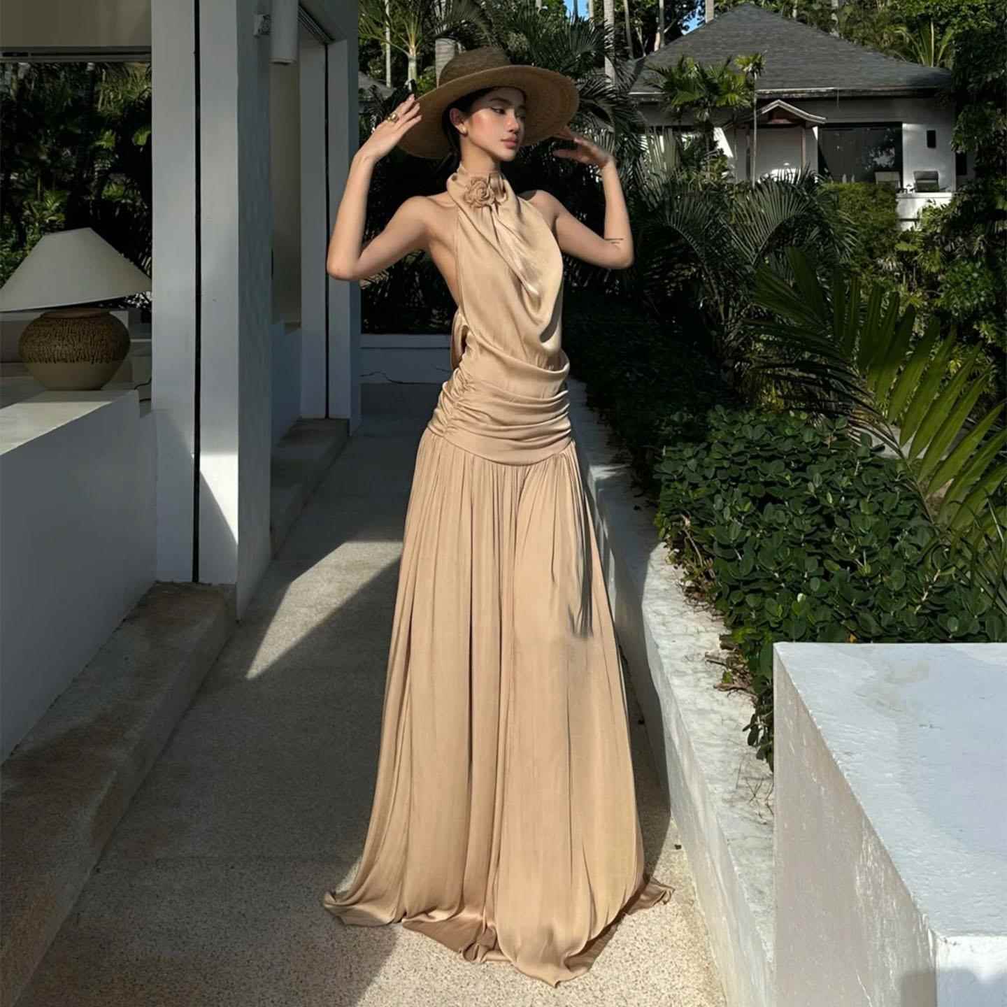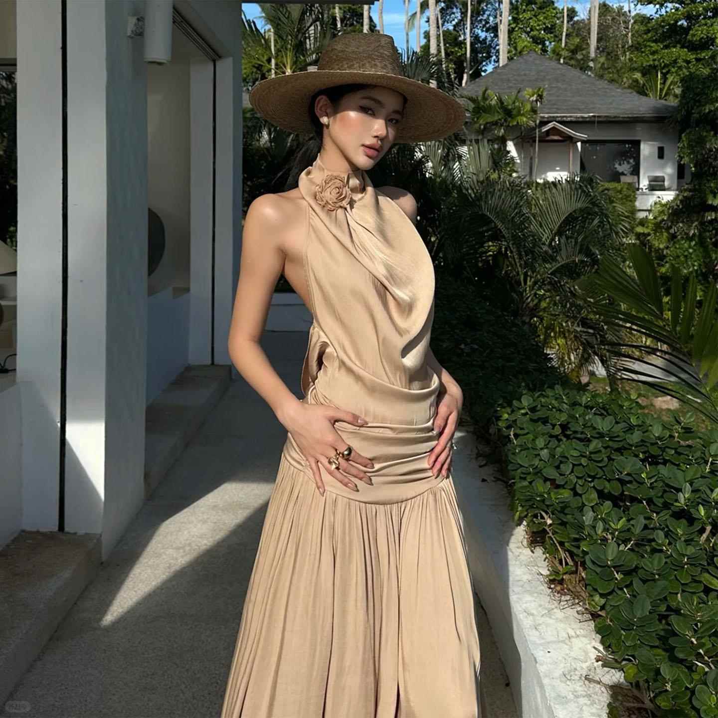 法式高级感无袖垂折领挂颈洋装女夏海边度假性感露背收腰拖地长裙