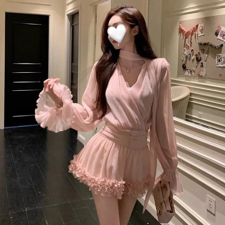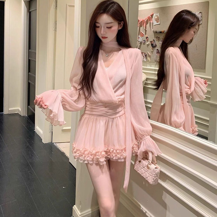 法式温柔风粉色飘带长袖连衣裙女早秋季气质收腰荷叶边花苞短裙子