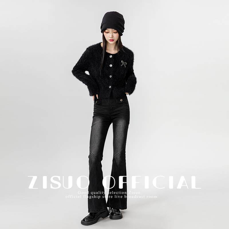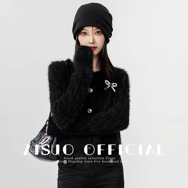 2025秋冬新款海马毛黑色毛衣外套女时尚蝴蝶结短款针织开衫短上衣