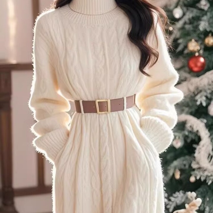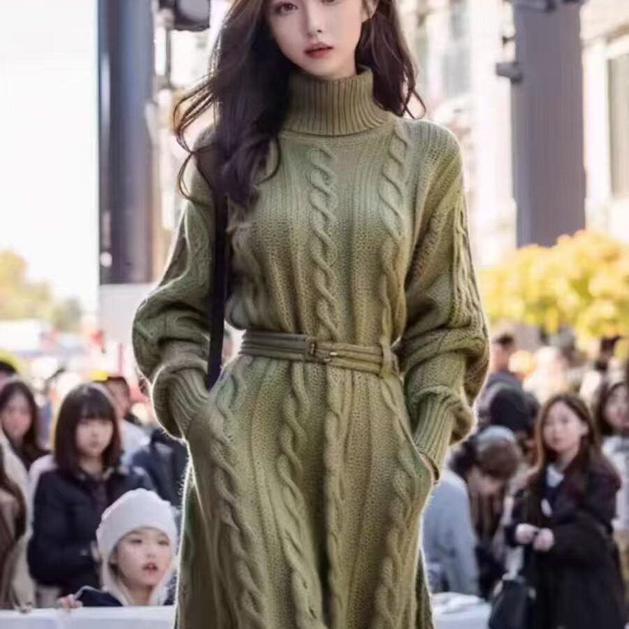 气质名媛超好看高领绞花针织连衣裙女轻奢高级感毛衣打底长裙冬季