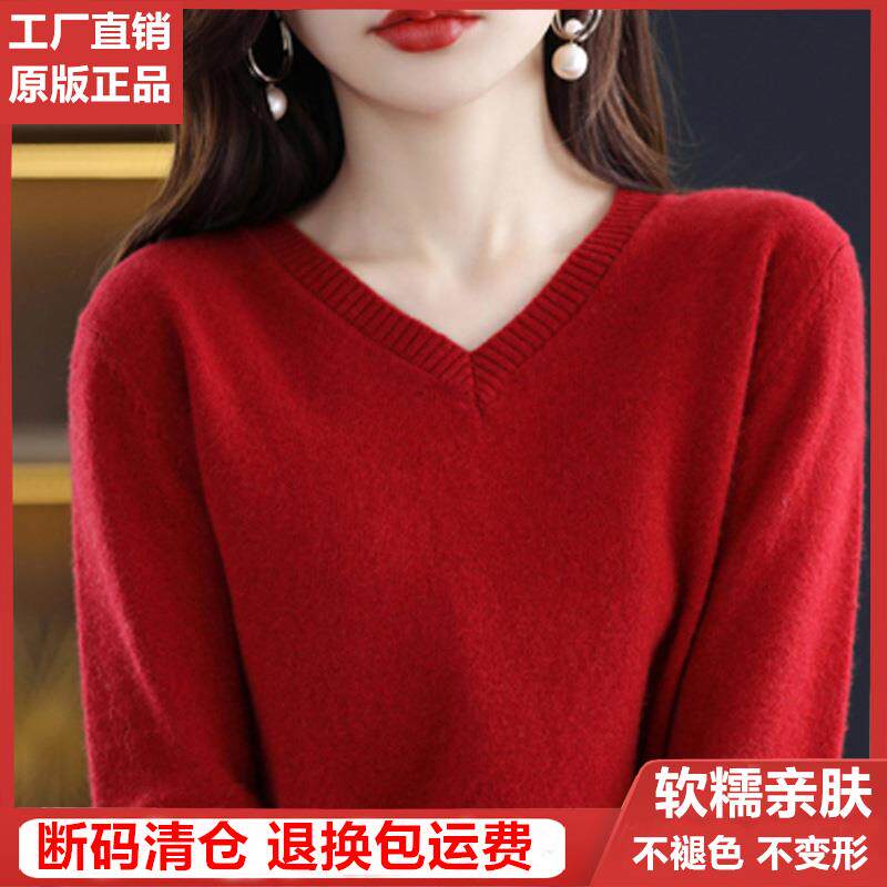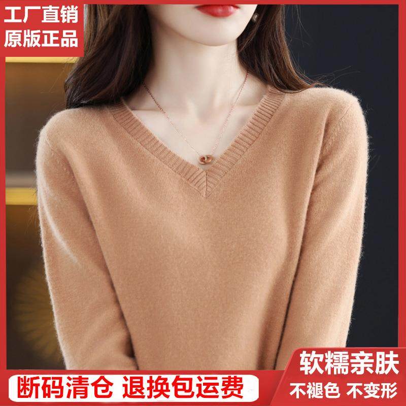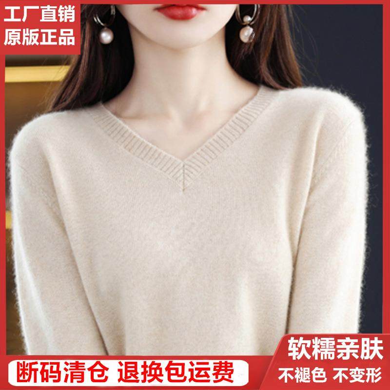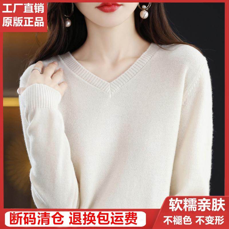 2025新款纯色羊绒衫女V领毛衣秋冬宽松套头羊毛衫内搭针织打底衫