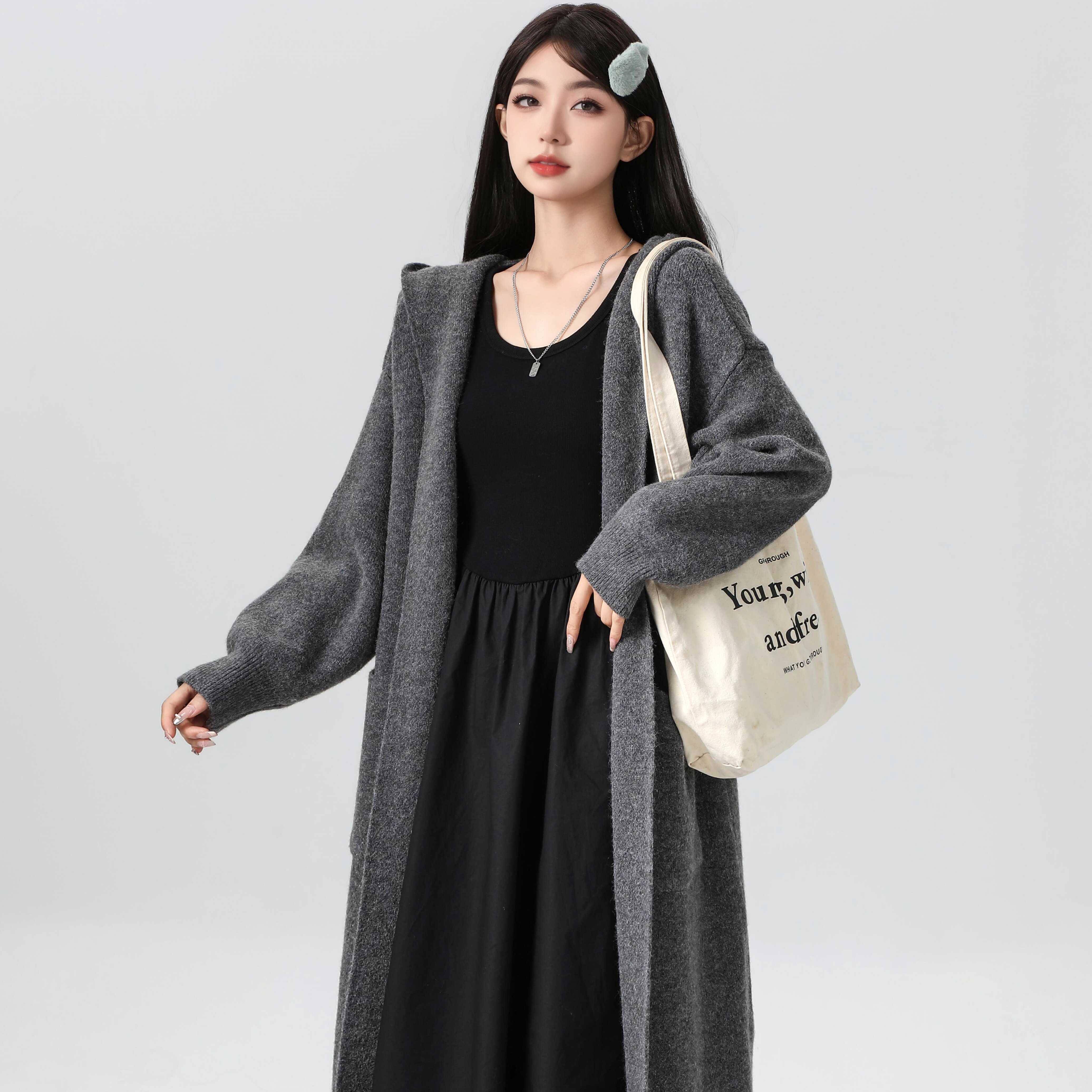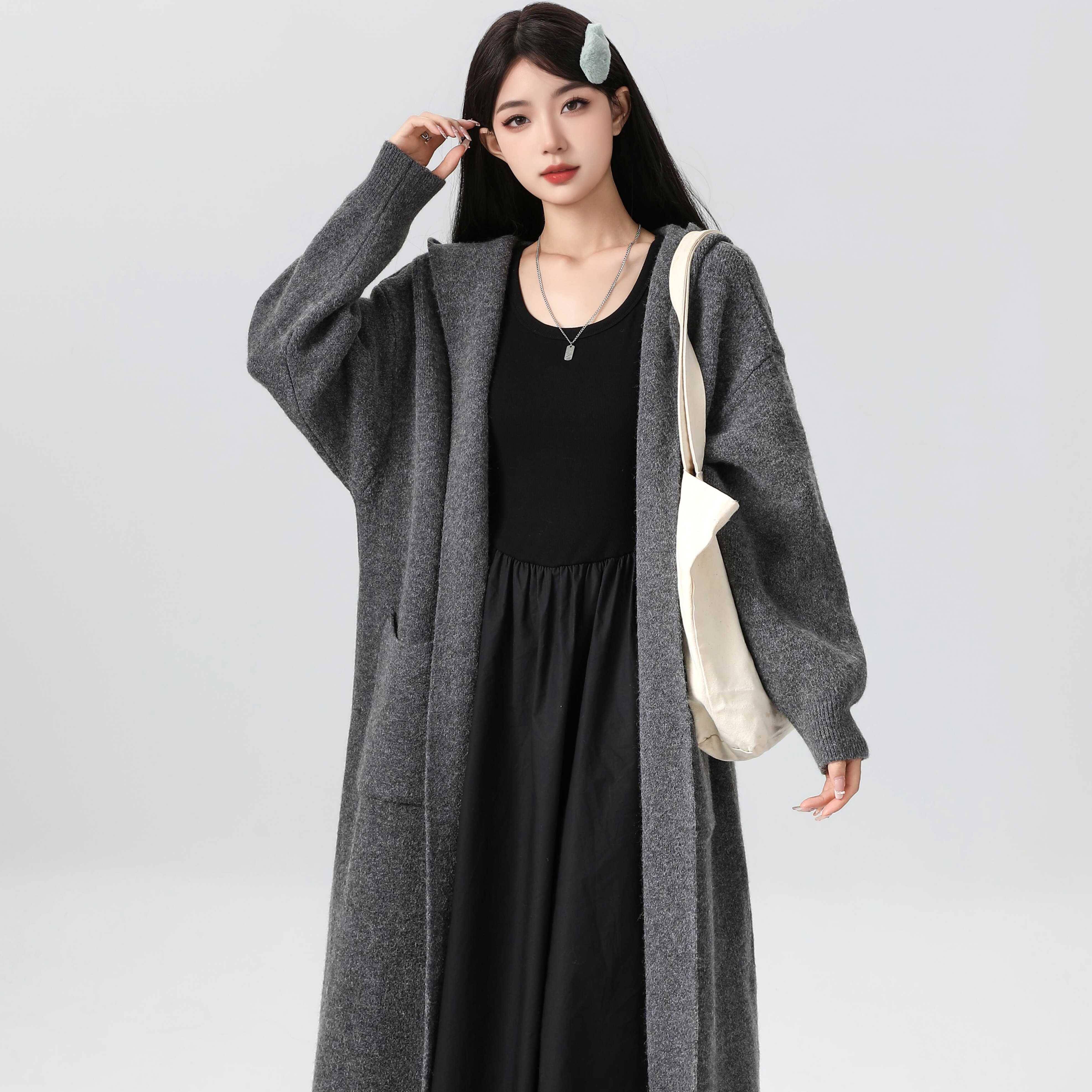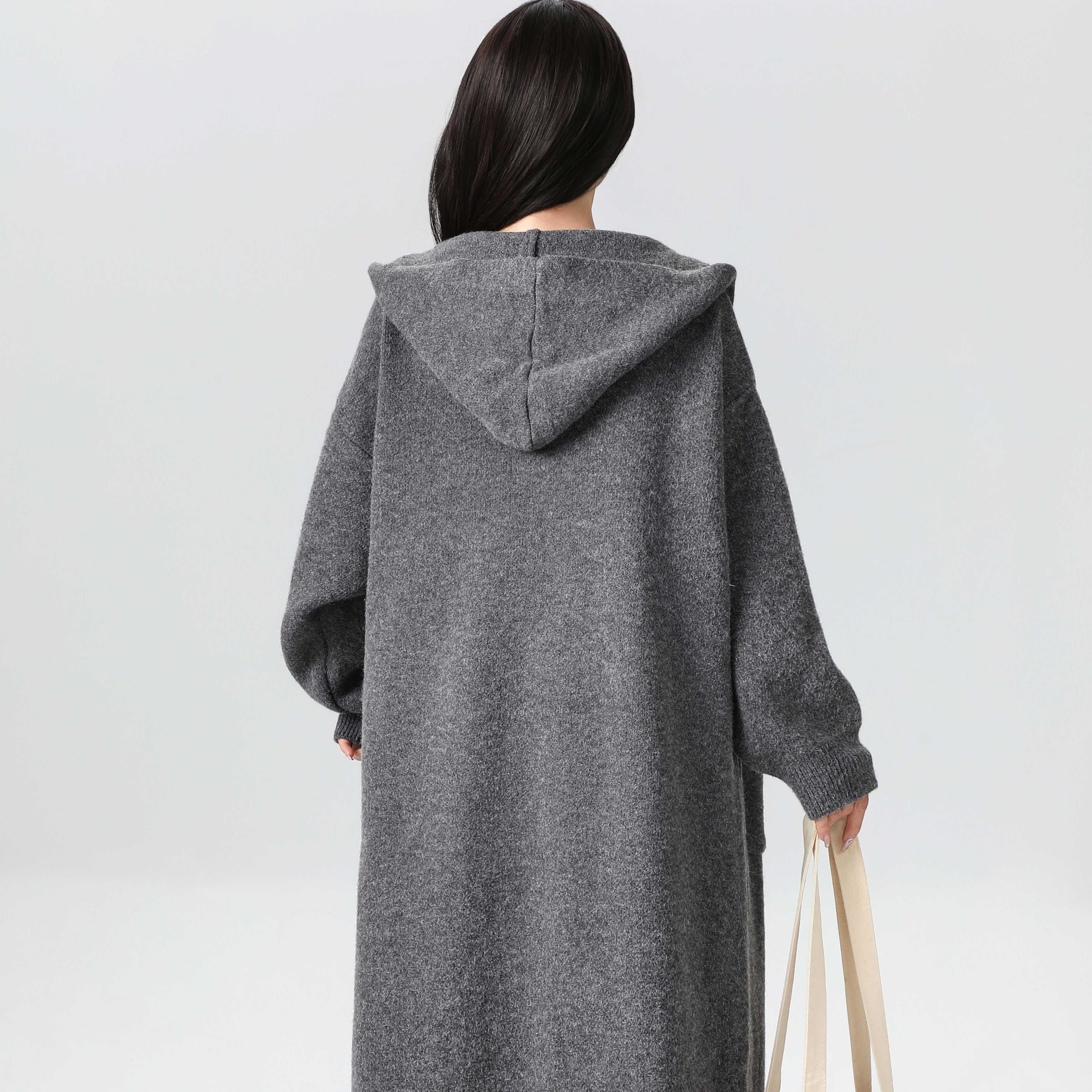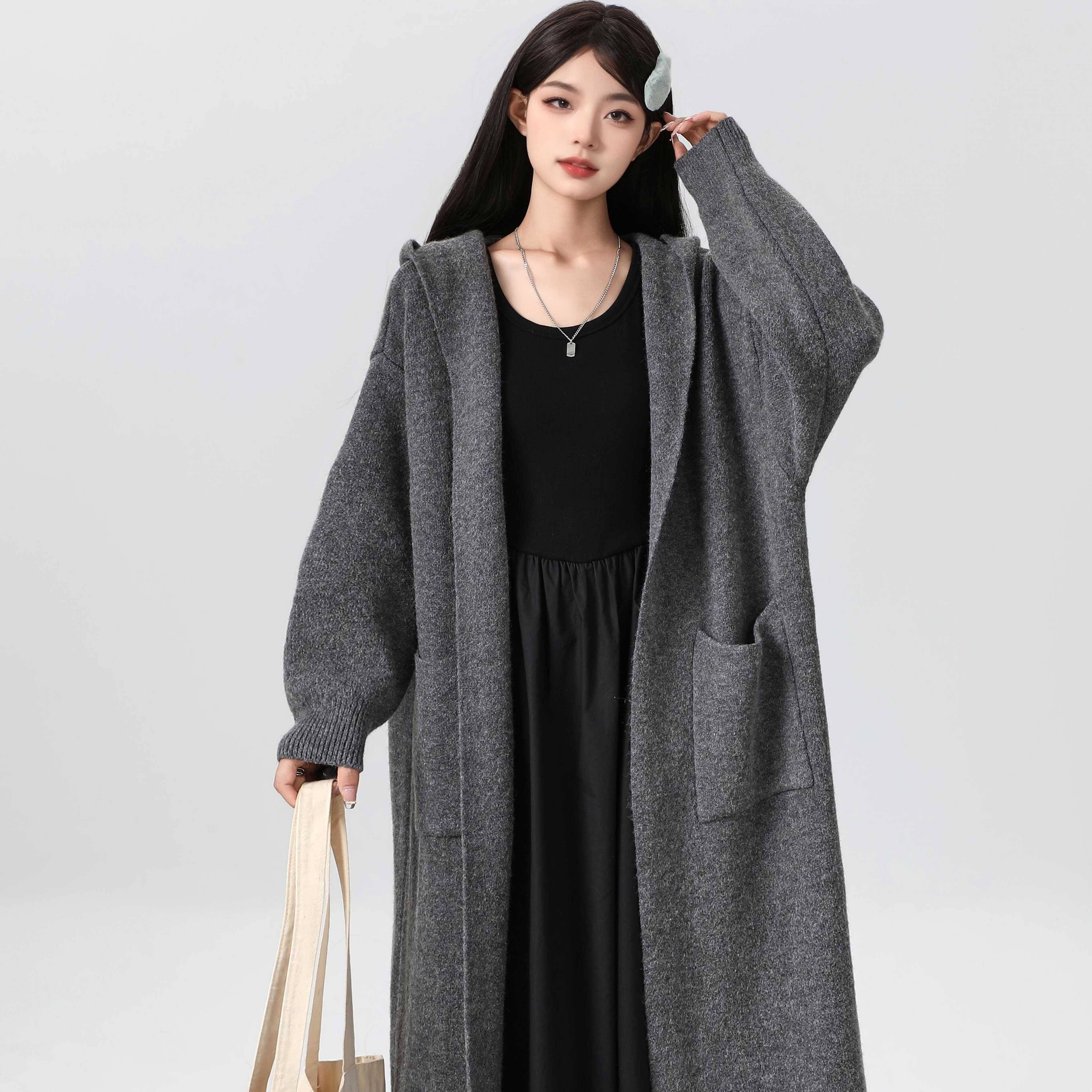 韩版慵懒风连帽开衫 女款灰色中长款毛衣 2024秋季新款大衣 通勤