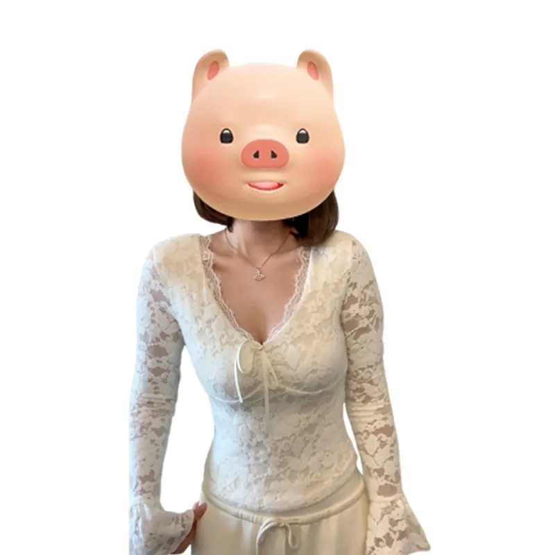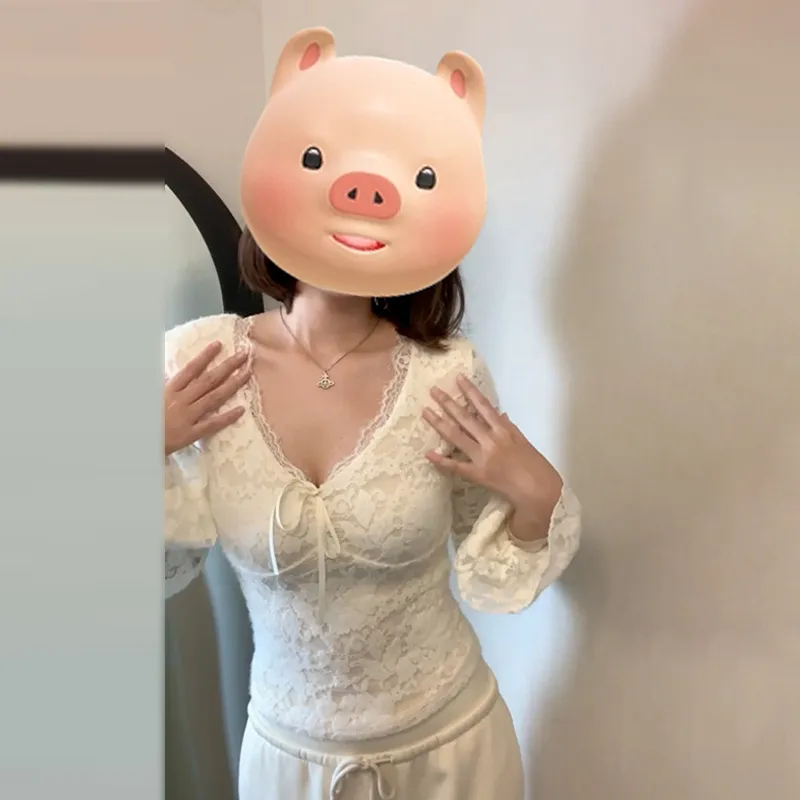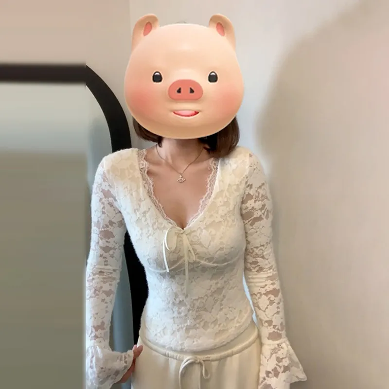 2025春季新款纯欲白色蕾丝v领长袖t恤女秋冬季修身内搭打底衫上衣