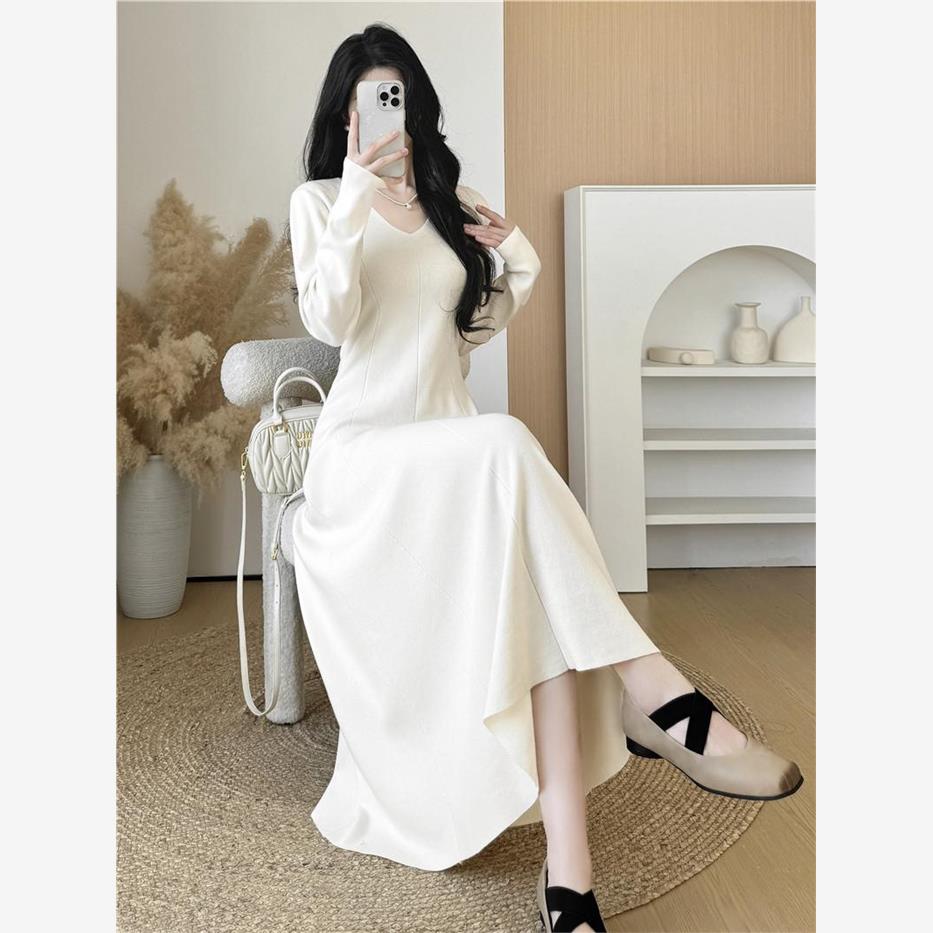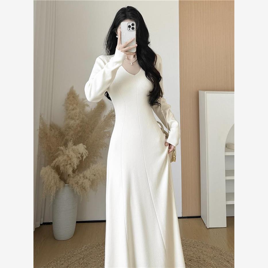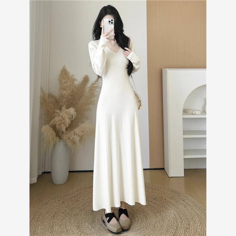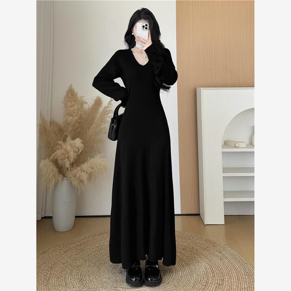 法式v领针织连衣裙女秋冬新款高级气质配大衣内搭打底毛衣裙长裙