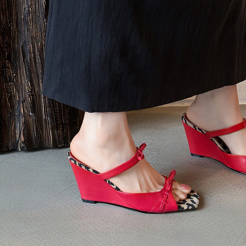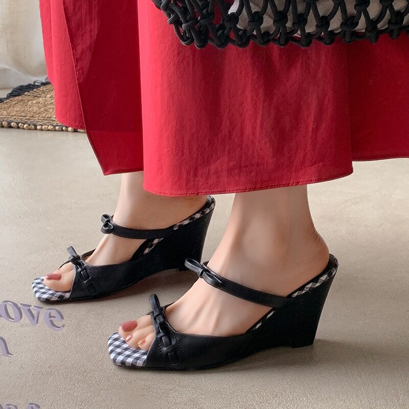 8cm~欧洲站穆勒鞋坡跟拖鞋外穿夏季新款一脚蹬蝴蝶结露趾凉鞋