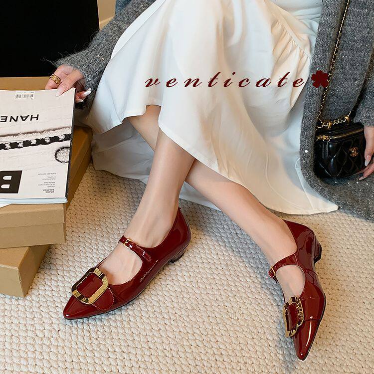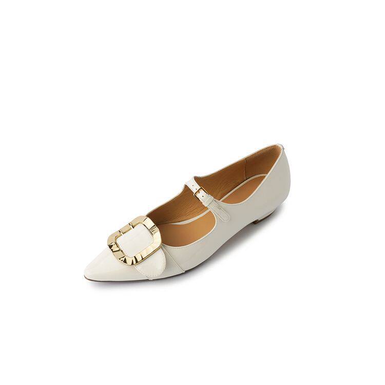 尖头金属方扣浅口一字扣带玛丽单鞋2025春季韩版平底里外全皮单鞋