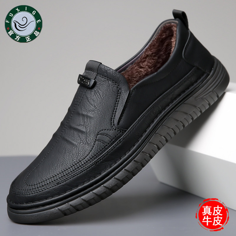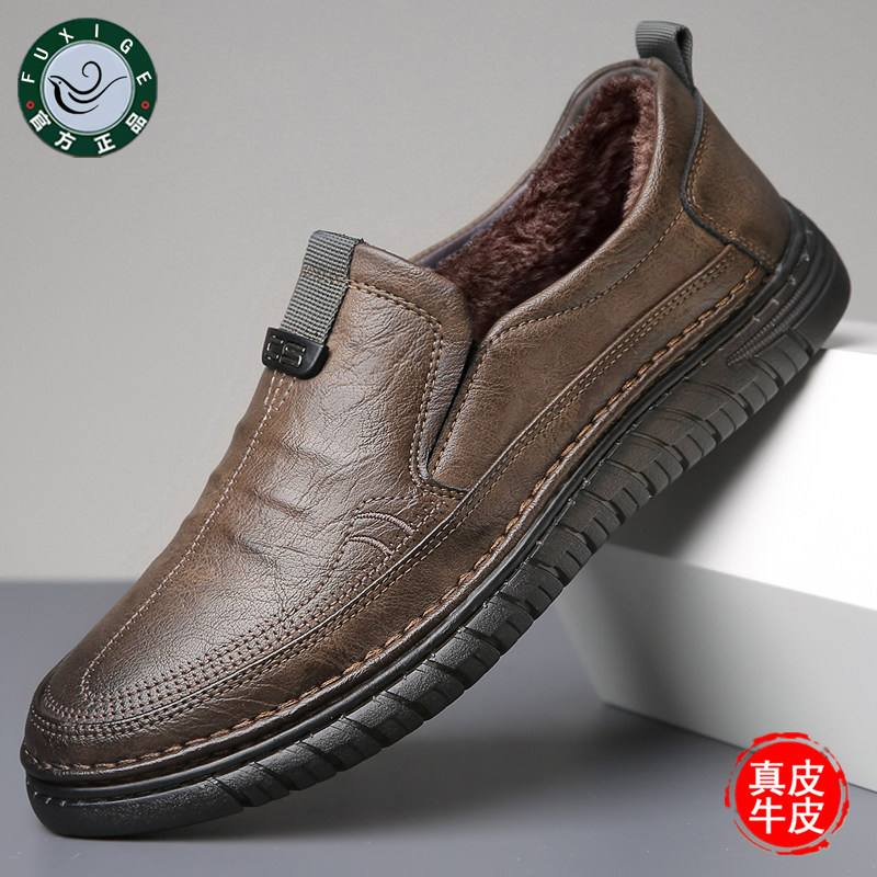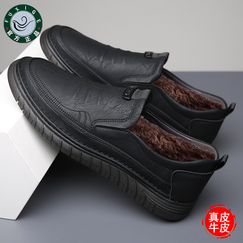 富喜鸽正品男鞋真皮休闲皮鞋男一脚蹬软底防滑冬季加绒保暖棉皮鞋