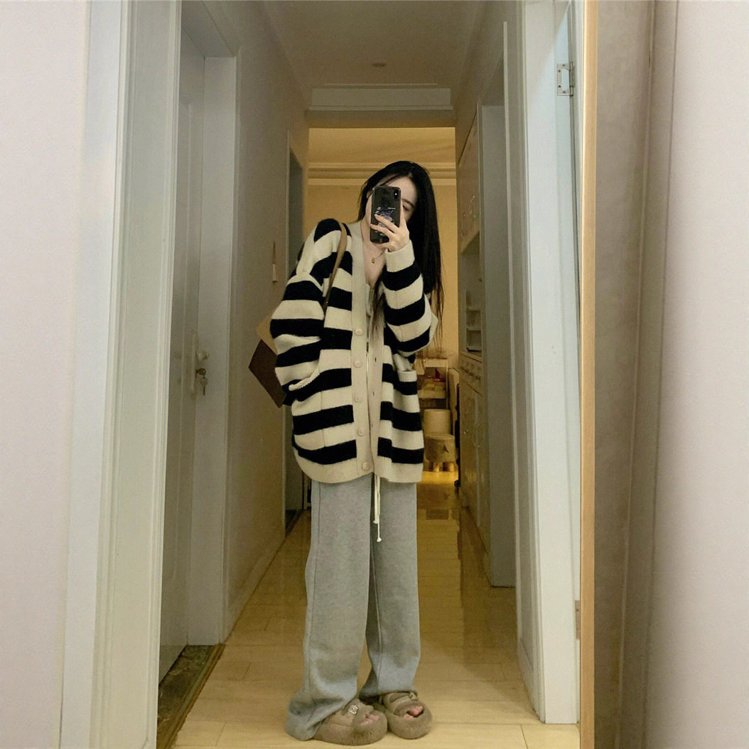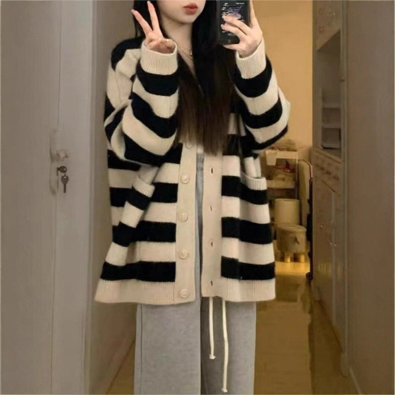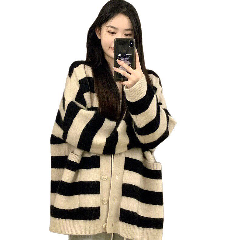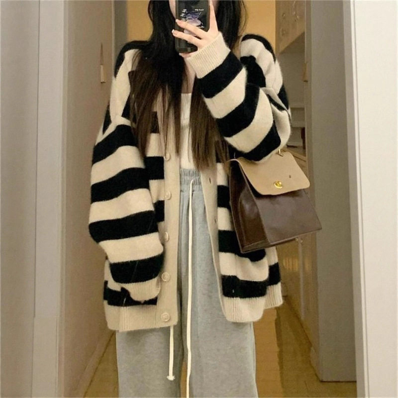 棉阳绒黑白条纹软糯针织开衫女秋冬新款慵懒风韩版宽松毛衣外套女
