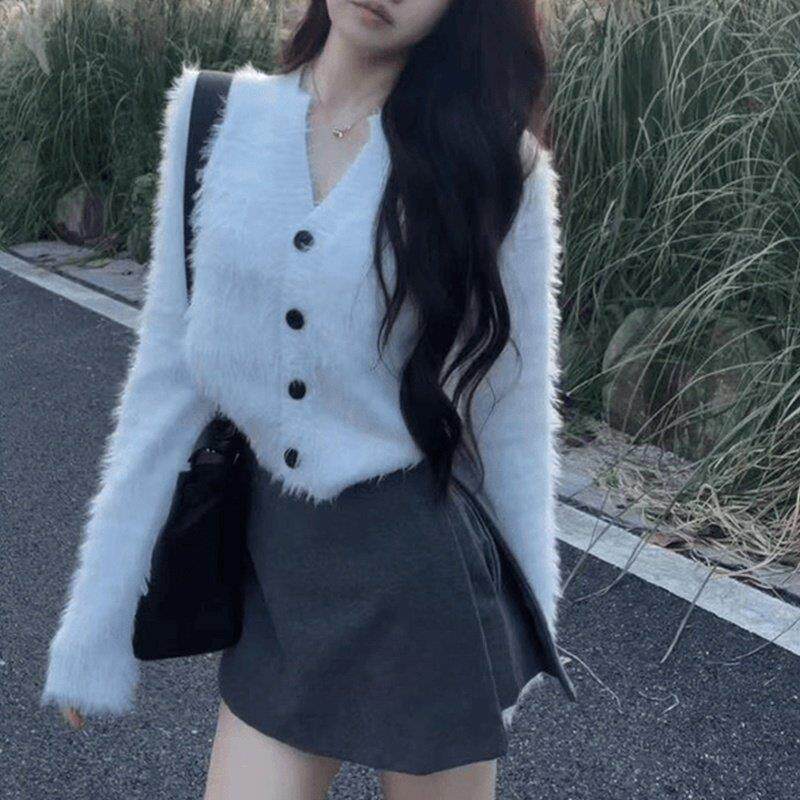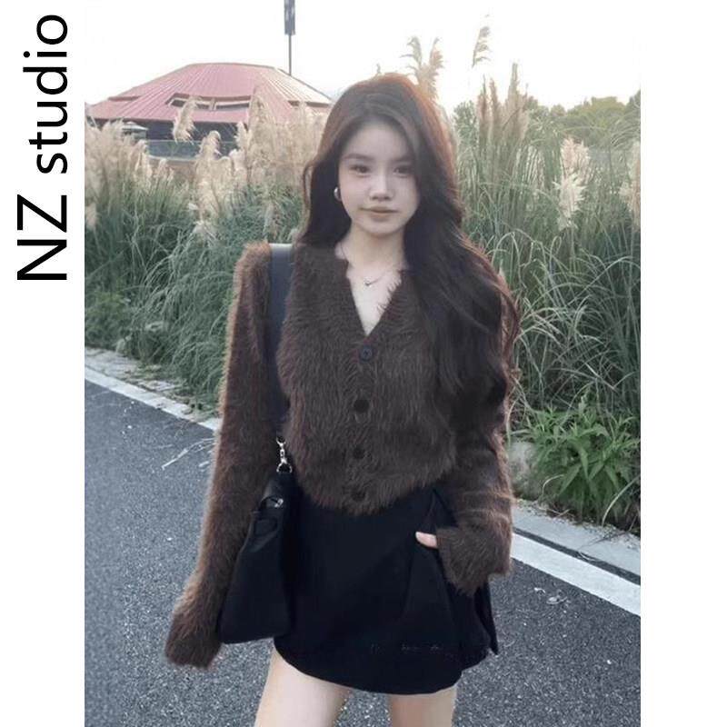 毛韩版时尚气质V领针织开ZXK-6902衫女冬新款加秋厚保暖短毛款绒