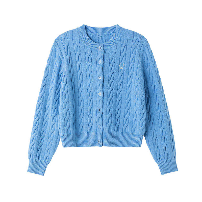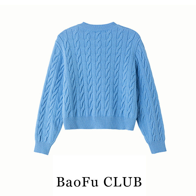 Bao Fu 蓝色麻花开衫毛衣女秋冬加厚宽松慵懒休闲针织上衣外套潮