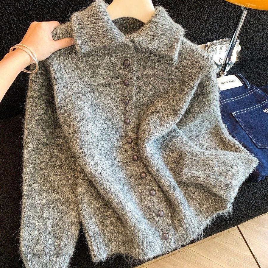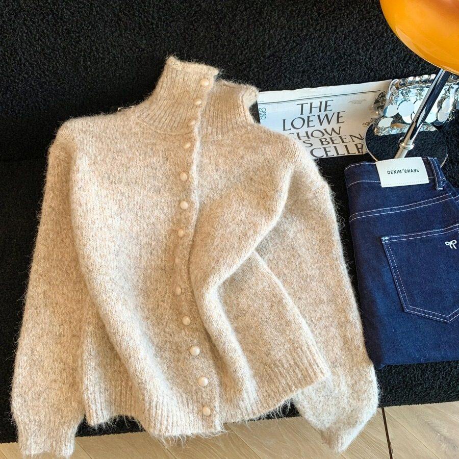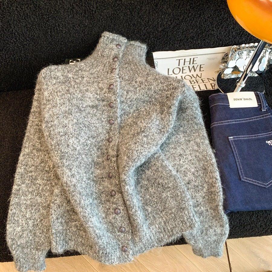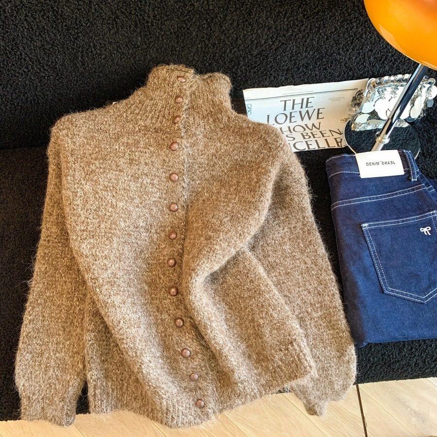 韩系简约复古高领针织毛衣女秋冬2025新款慵懒风宽松加厚开衫上衣