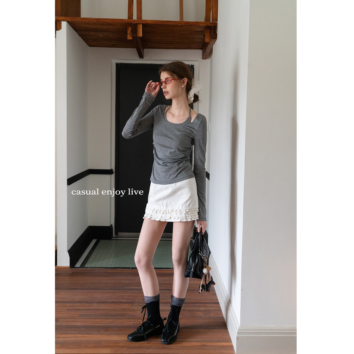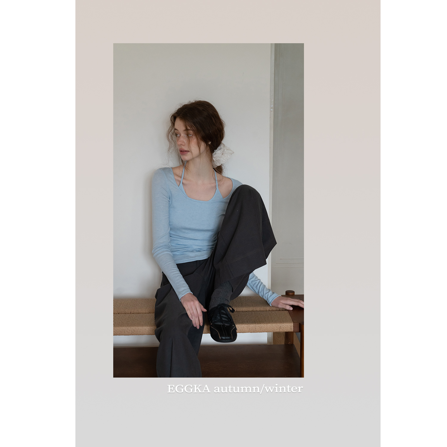 EGGKA极简风挂脖绑带假两件T恤女春季新款方领修身长袖显瘦上衣