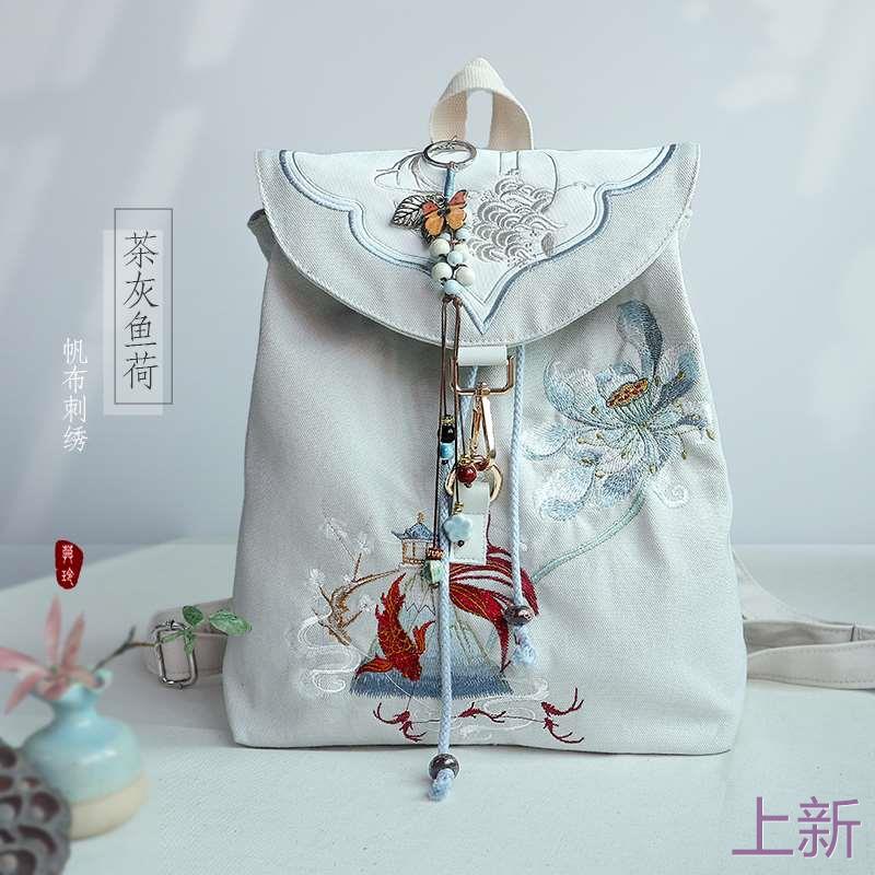 15寸电脑中国风古风汉服文艺复古民族风刺绣帆布双肩包少女新款