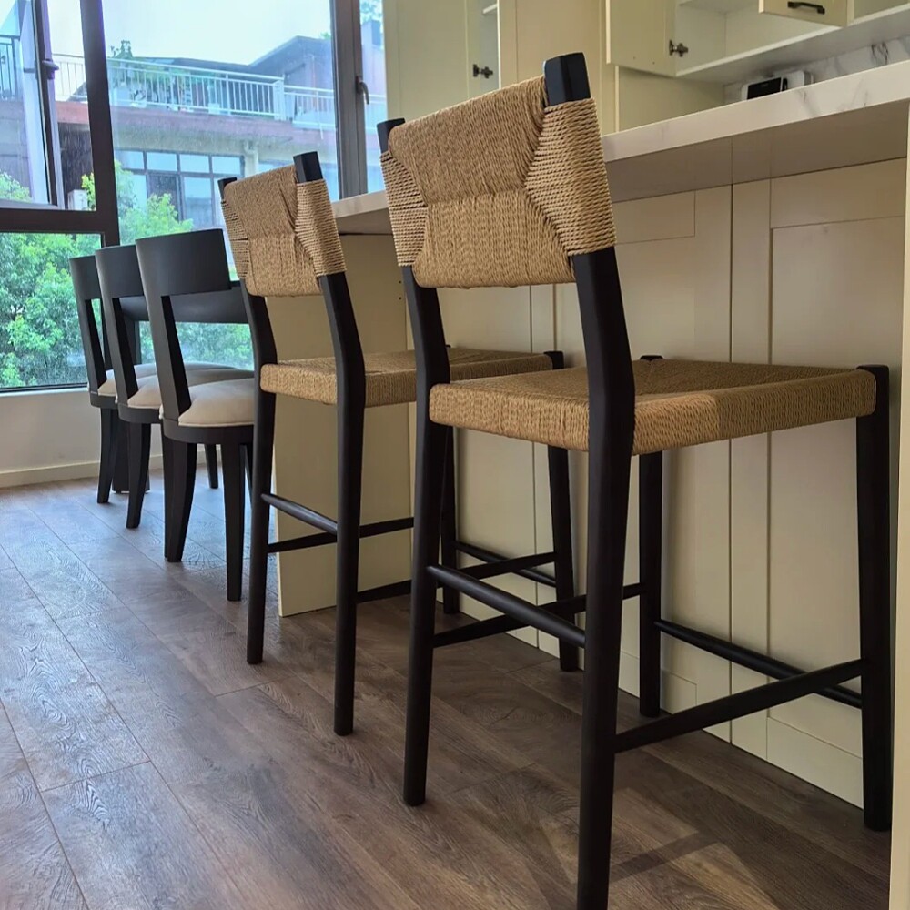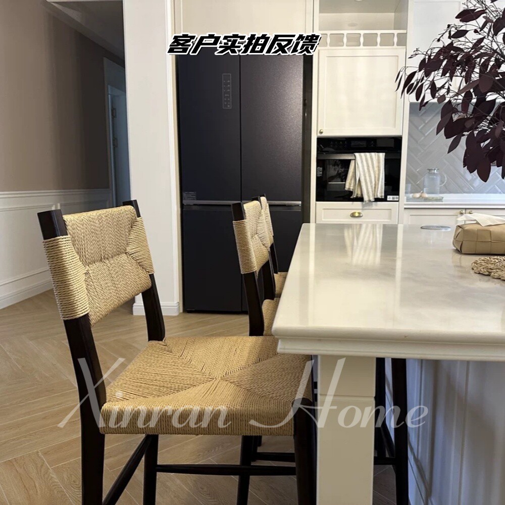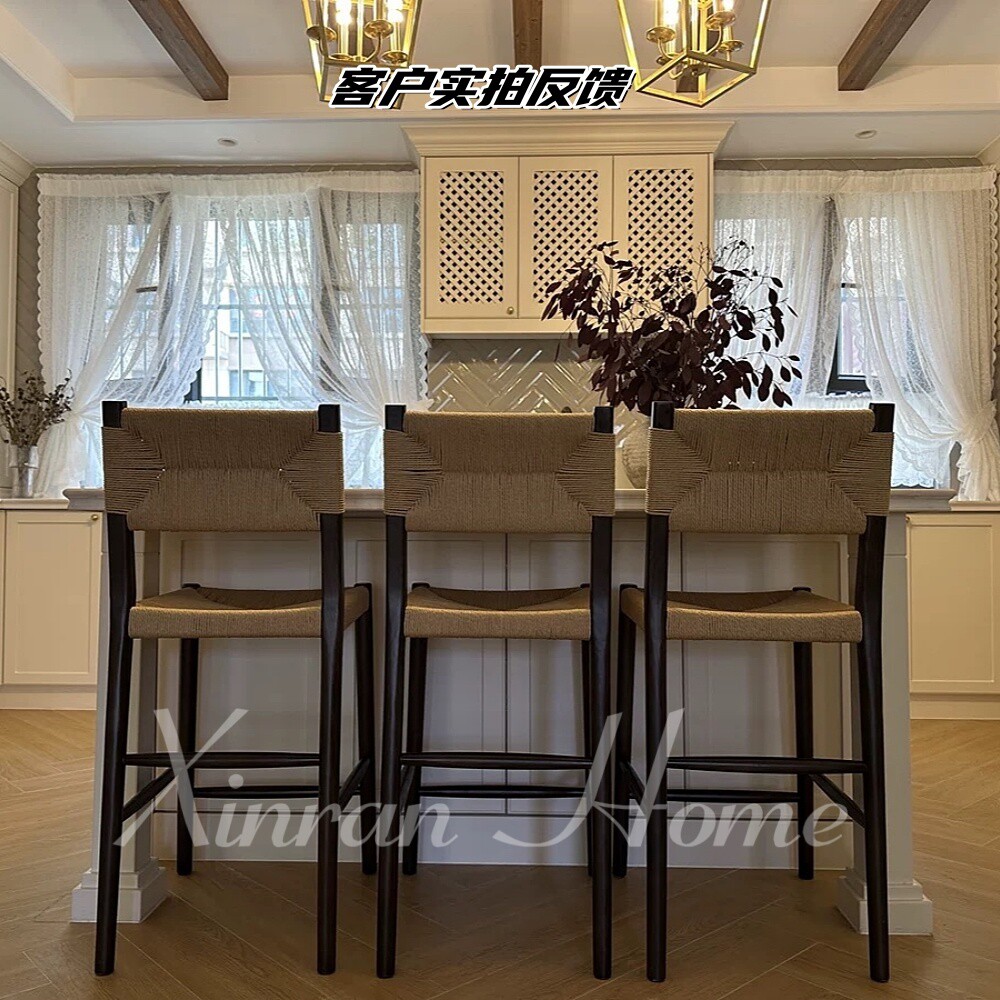 北欧风格实木轻奢酒吧椅现代简约家用吧台椅高脚凳复古绳编餐