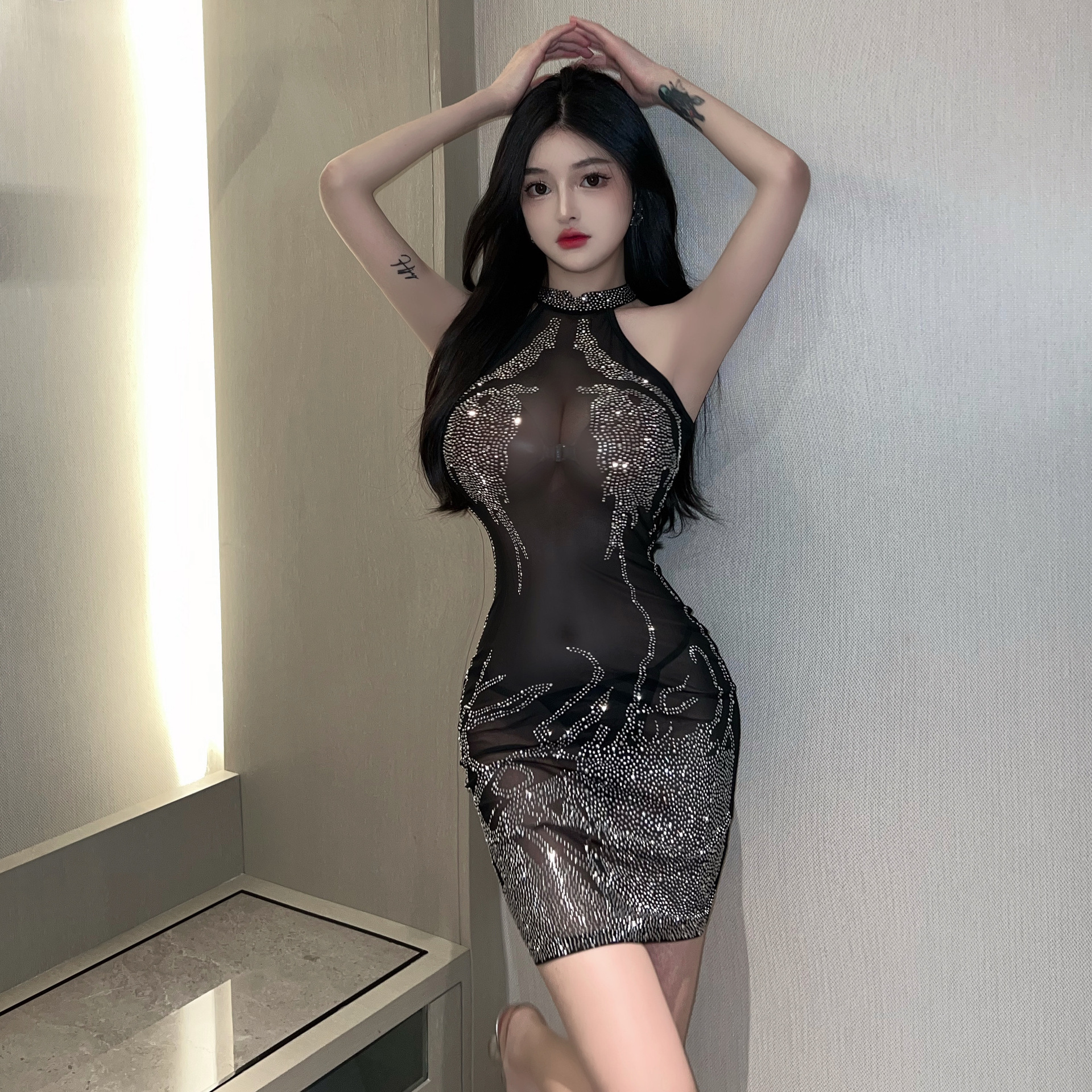 欧美2025跨境外贸性感辣妹网纱烫钻透视重工修身连衣裙女