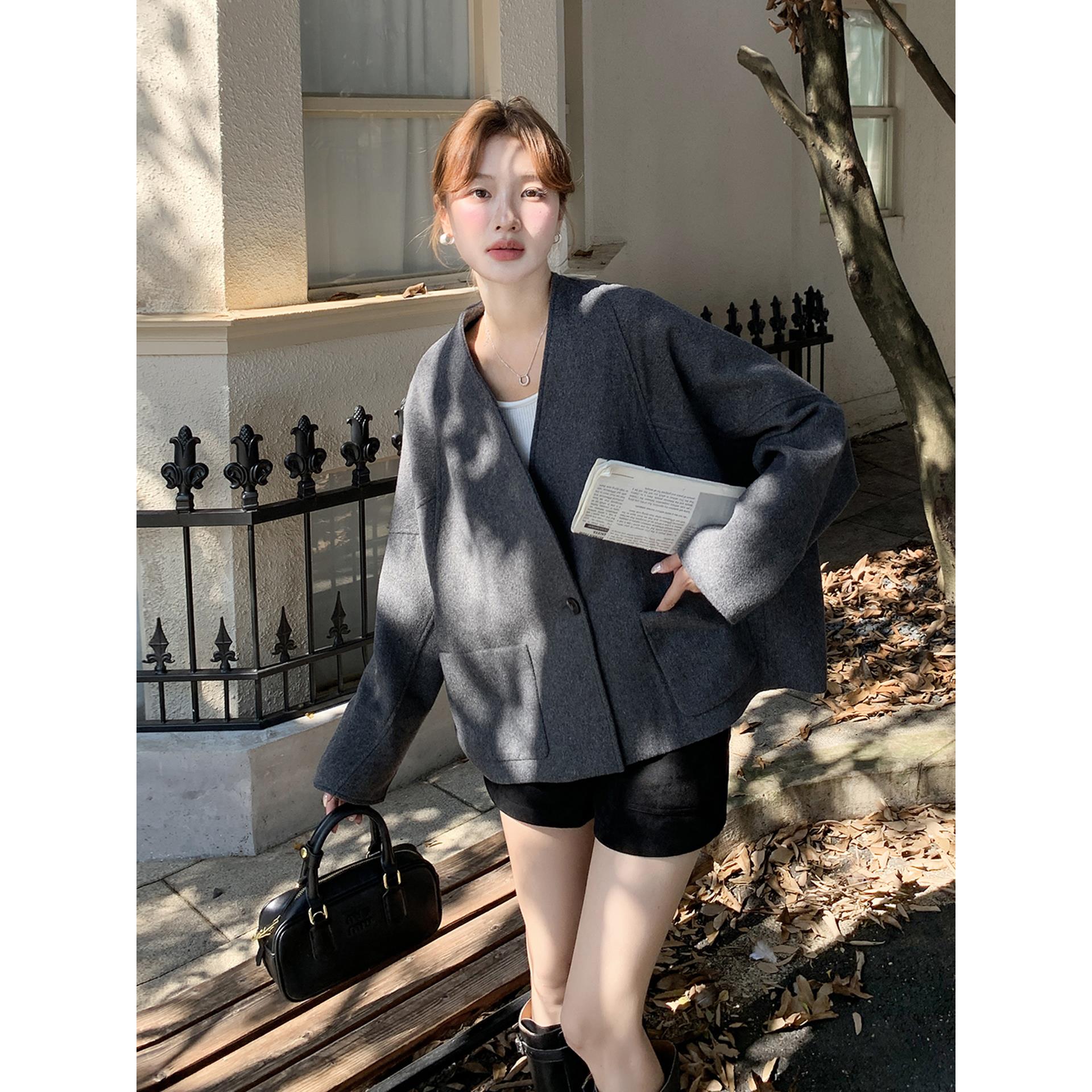 灰色蝙蝠袖飘带毛呢外套女秋冬2025新款高级感穿搭加厚呢子大衣