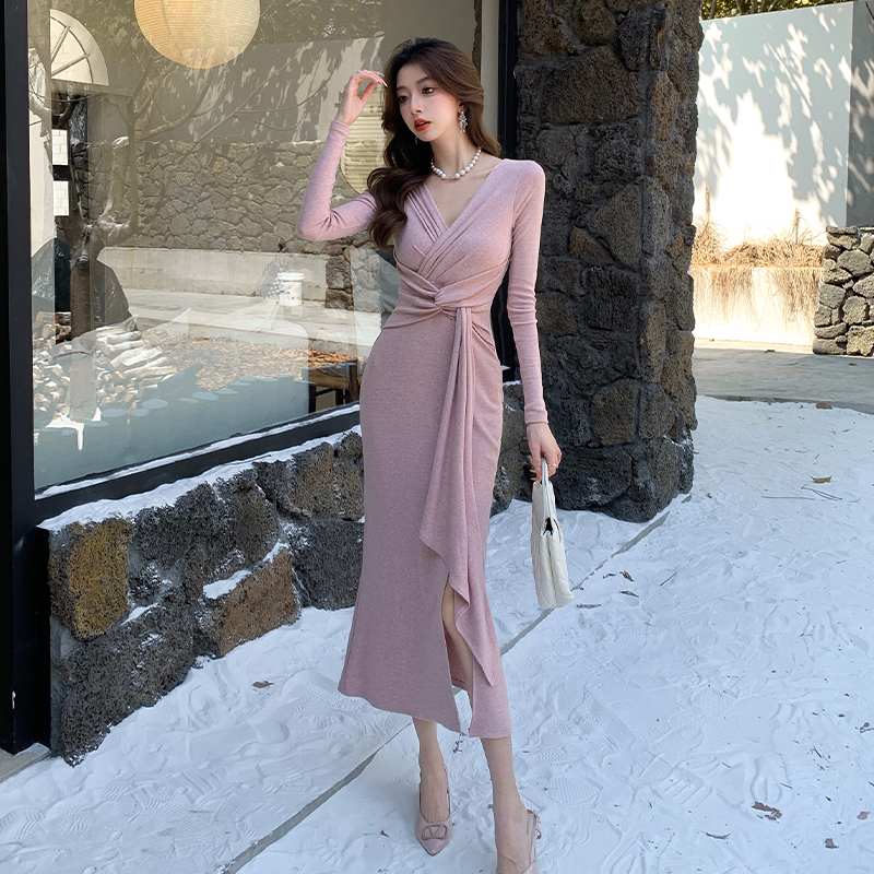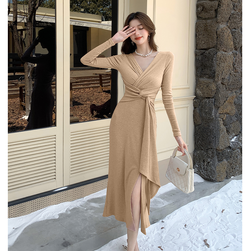 2025秋冬新款纯欲修身收腰纽结绑带连衣裙女气质长袖收腰包臀长裙