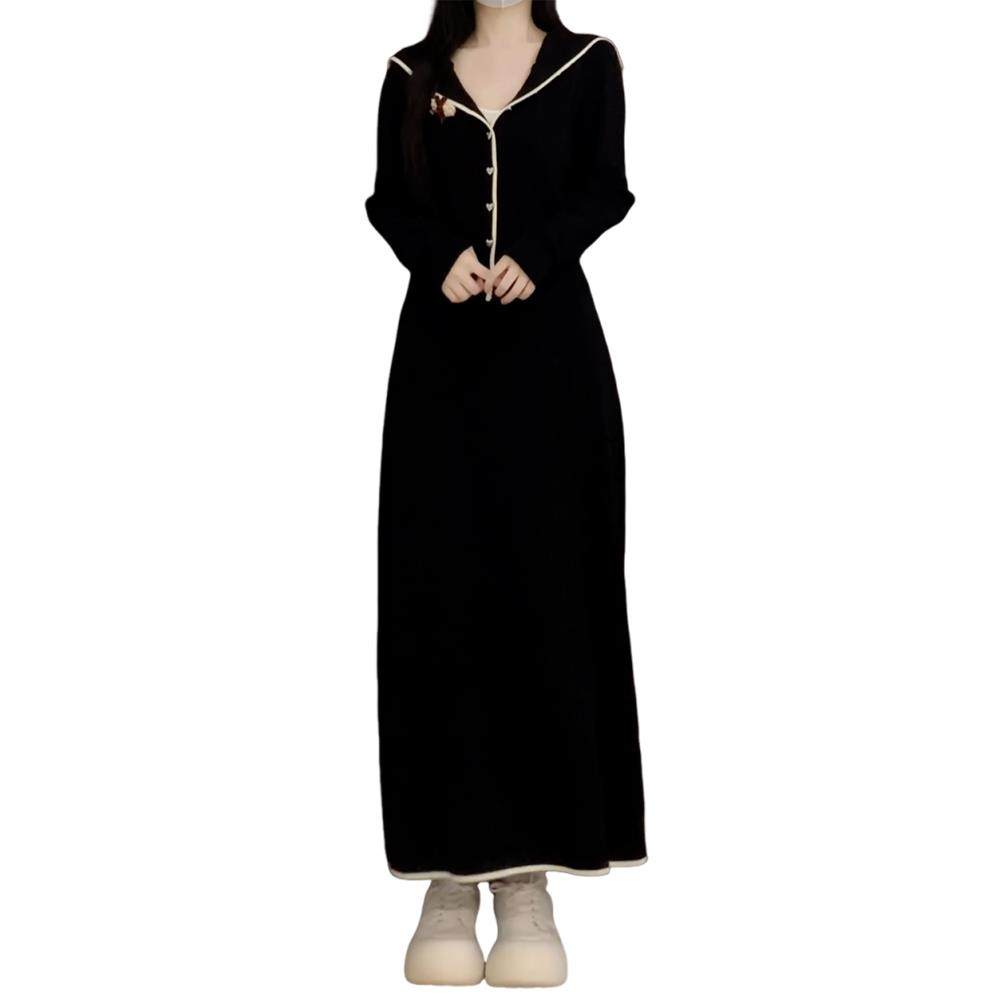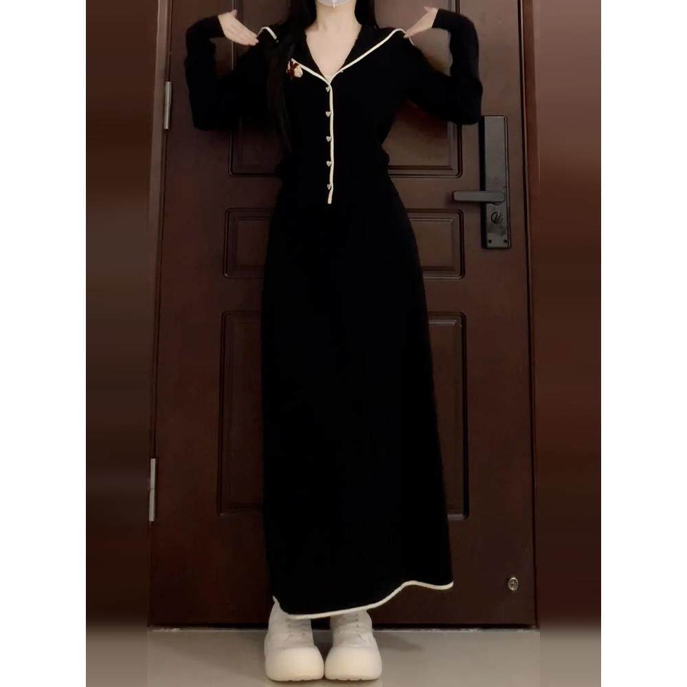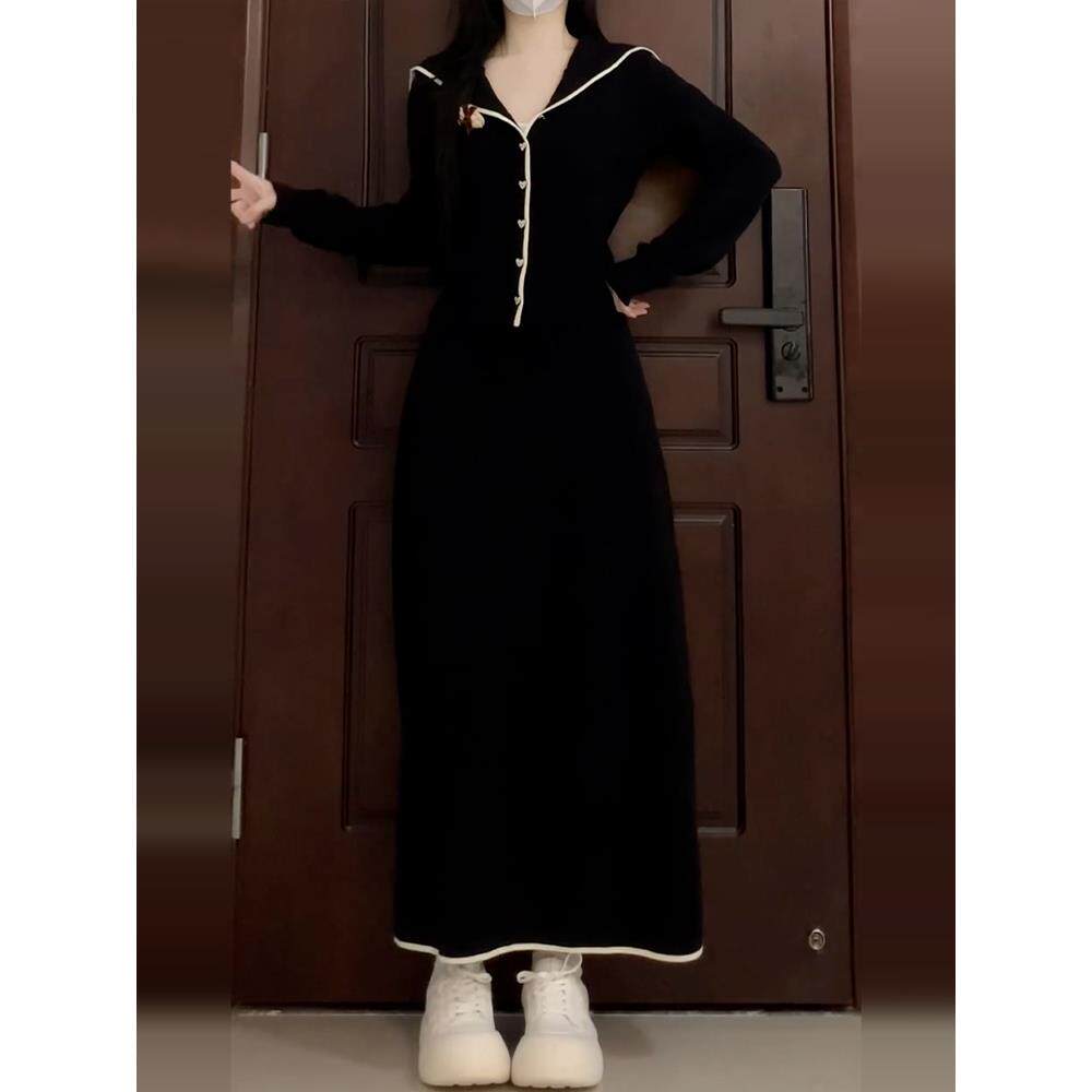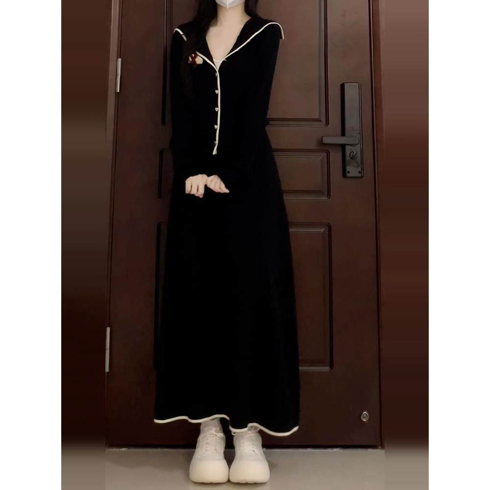 法式学院风海军领黑色针织连衣裙子女秋冬2025新款高级感套装长裙