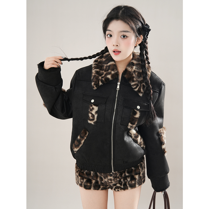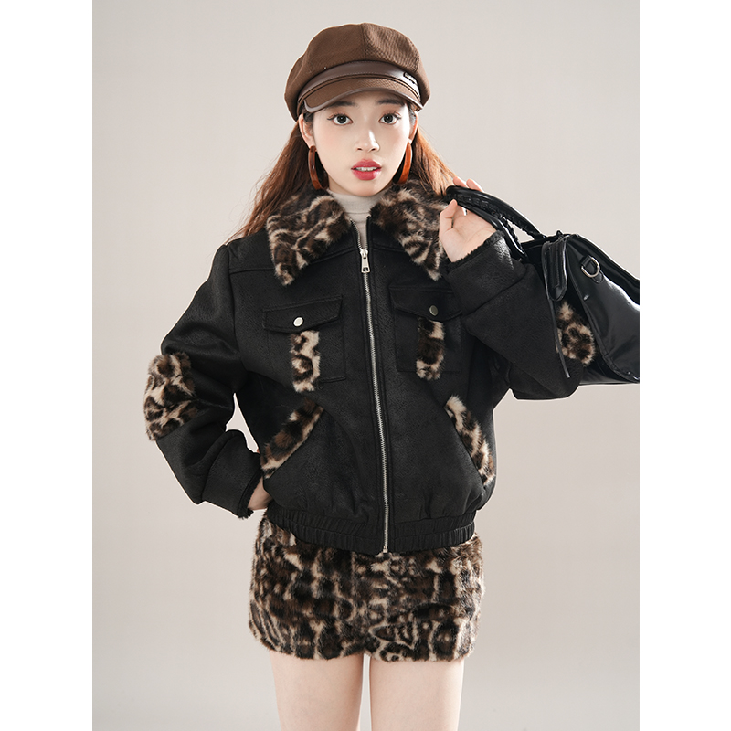 【古早圣尔曼】秋冬纯欲辣妹风豹纹拼接毛呢外套+毛毛短裤两件套