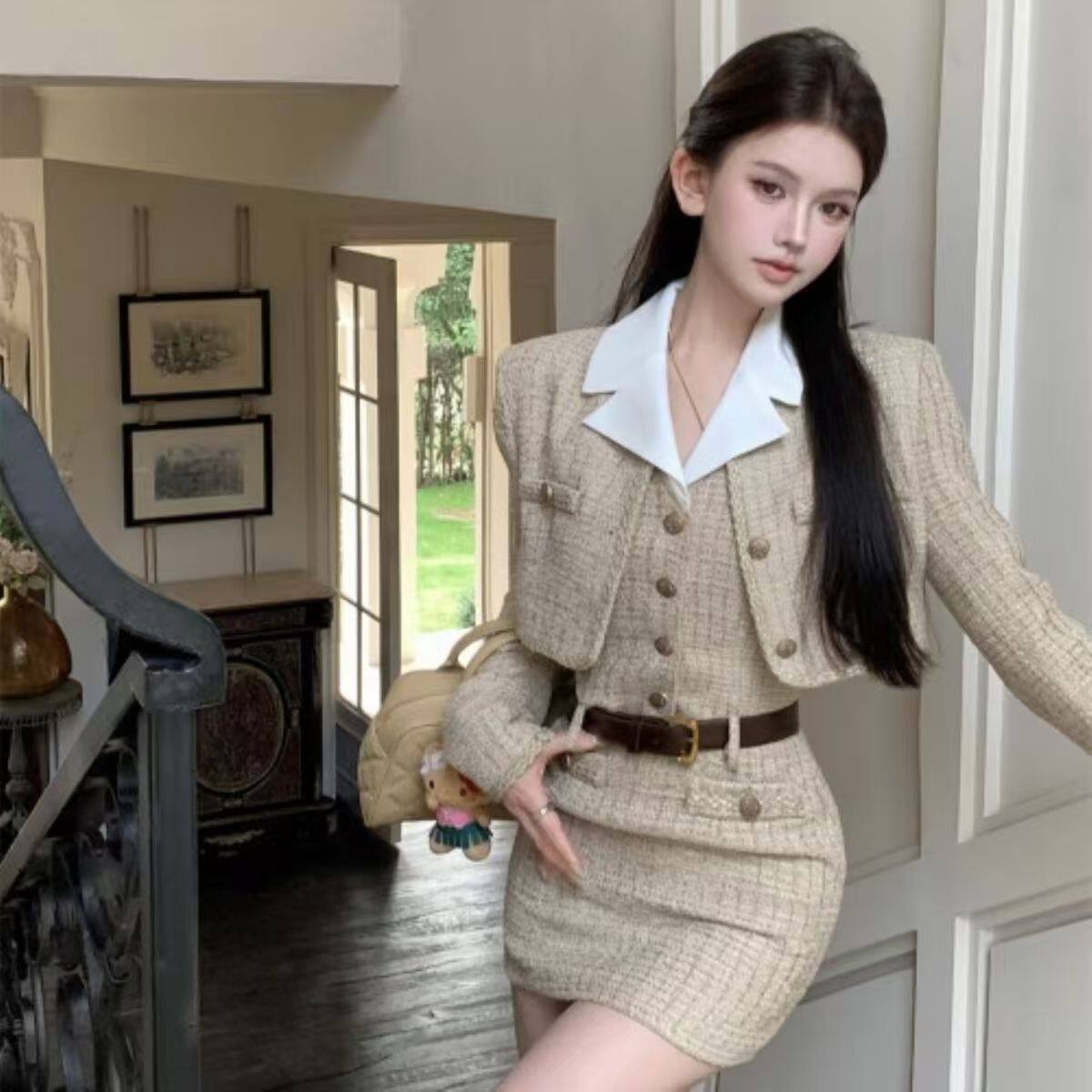 气质法式千金纽扣香风拼接短外套秋冬季高级连衣裙短裙两件套2025