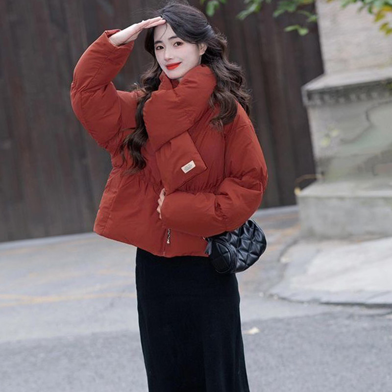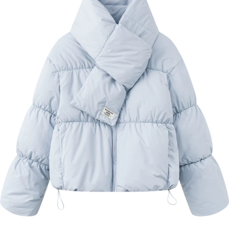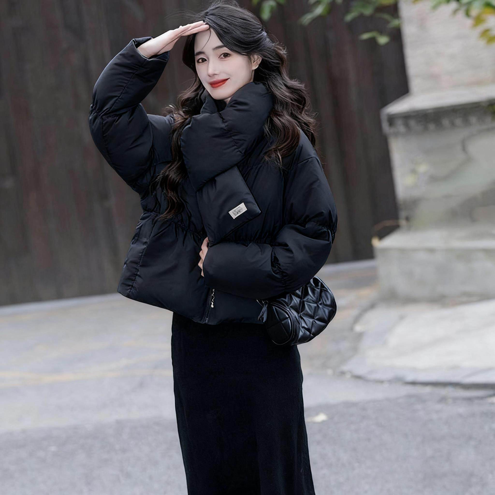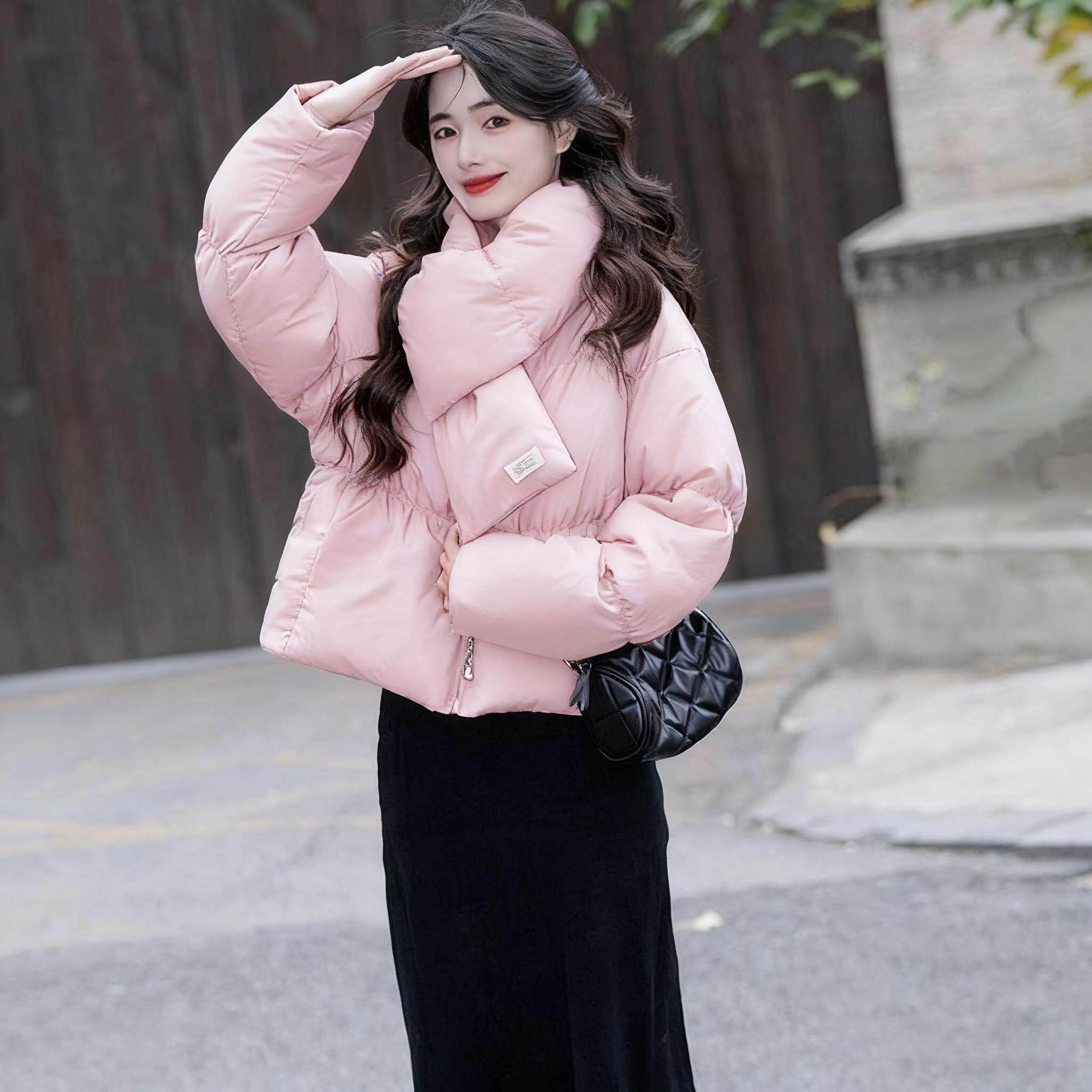 2025冬季新款韩版宽松加厚棉袄蓝色棉衣围巾外套短款羽绒面包服女
