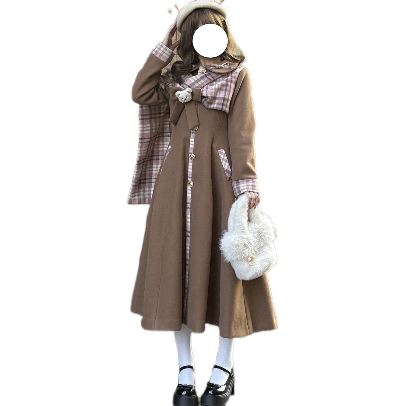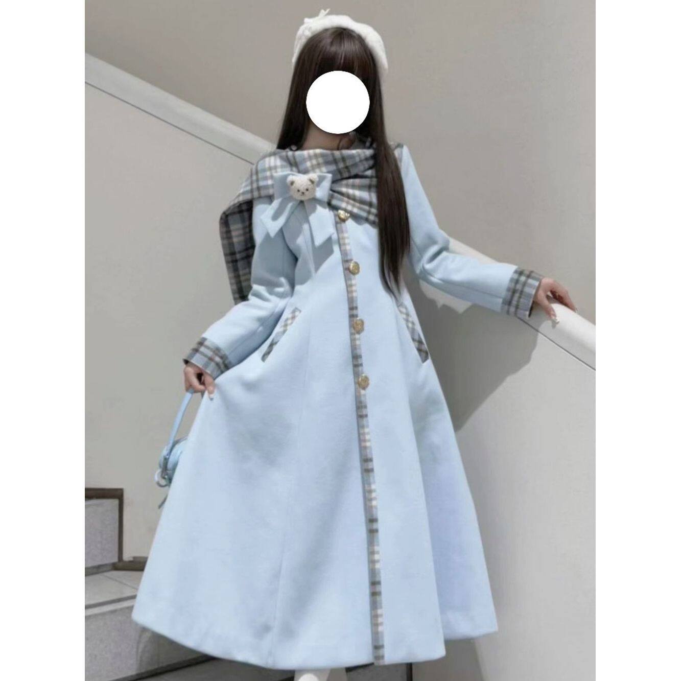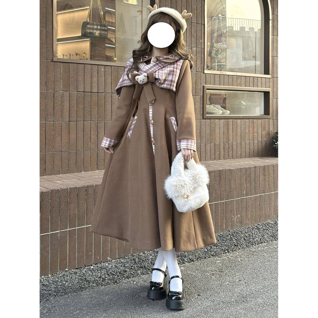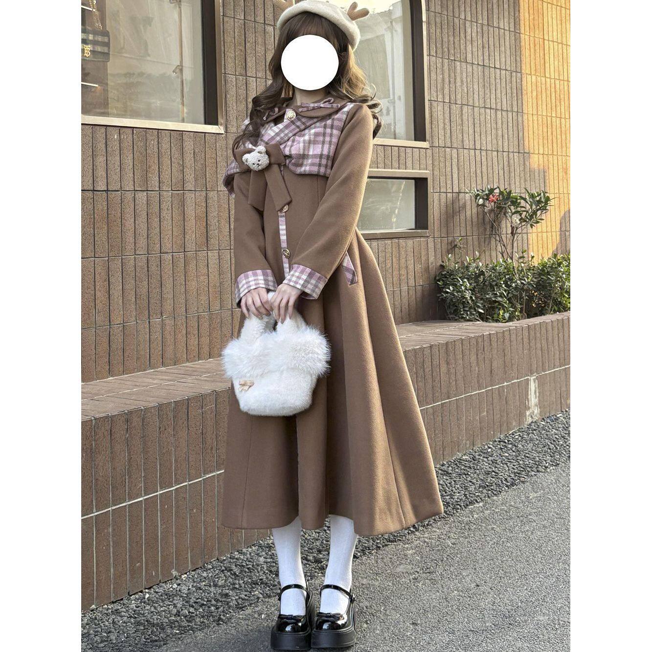 【曲奇慕斯】秋冬设计感优雅气质韩系小熊蝴蝶结拼接毛呢长款大衣