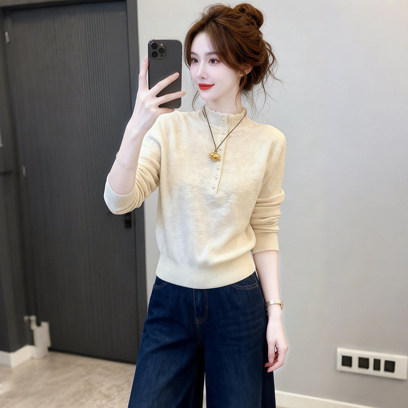 2025秋冬季加厚木耳边钉珠提花蕾丝毛针织衫宽松百搭温柔内搭上衣