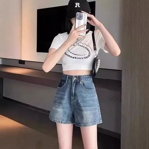 辣妹大码女显瘦热裤口袋设计感胖mm夏季高腰复古牛仔短裤薄款撞色
