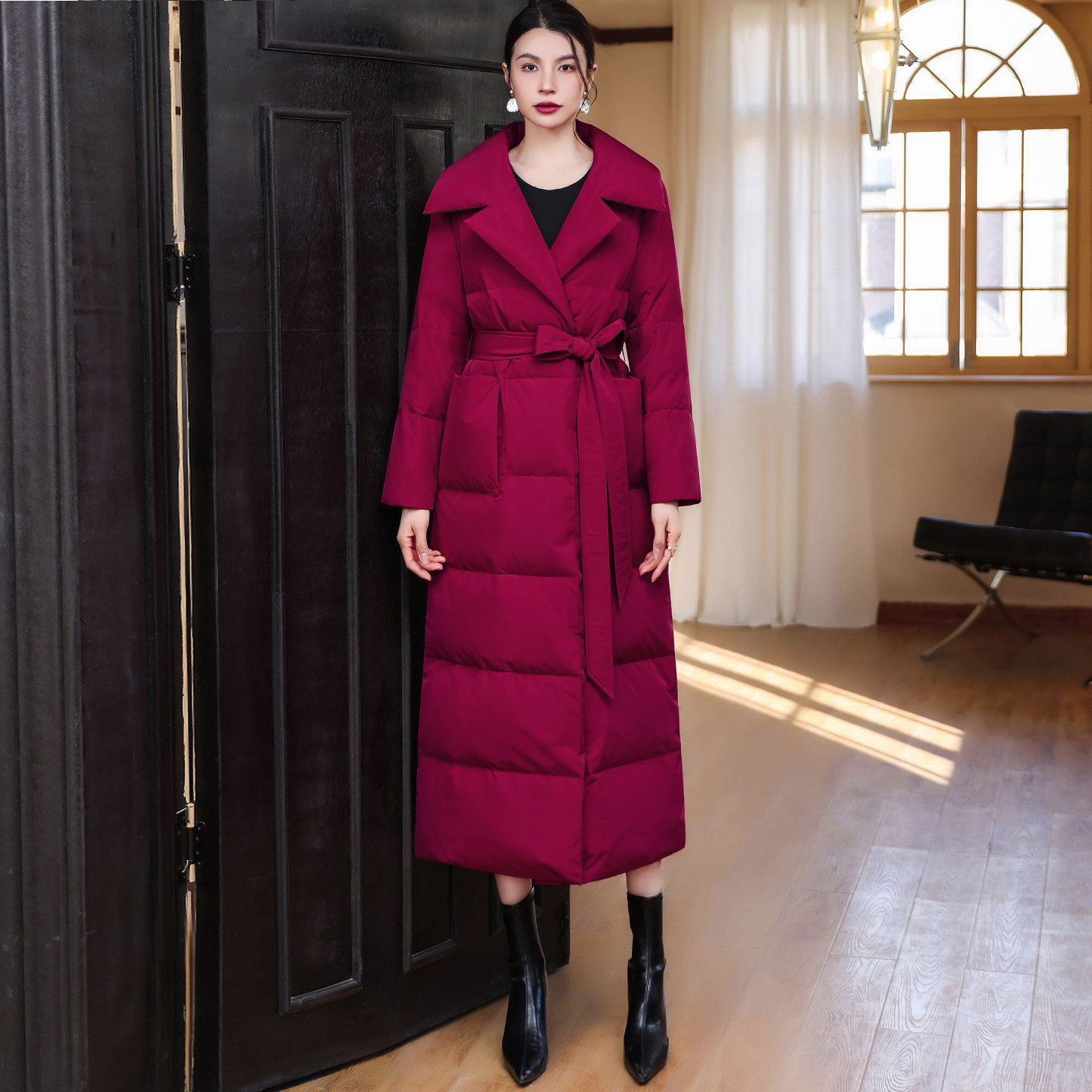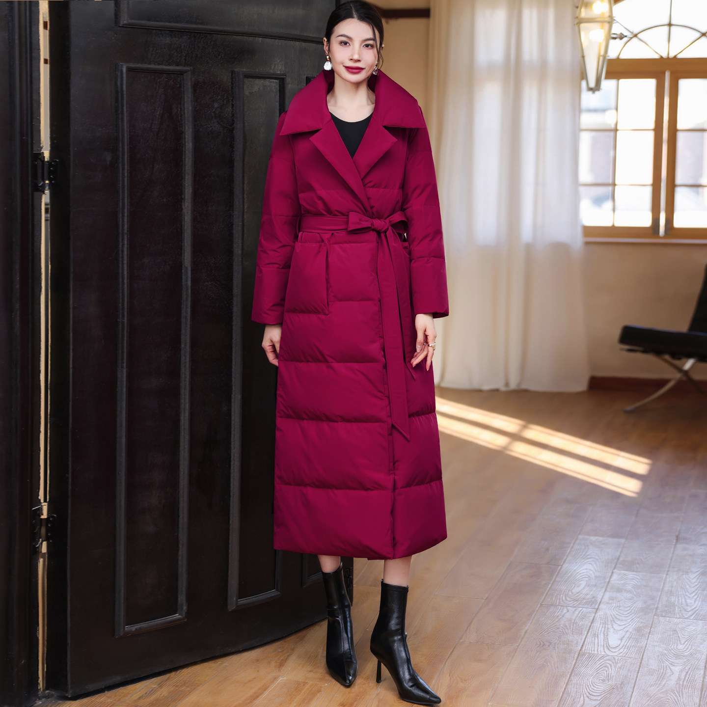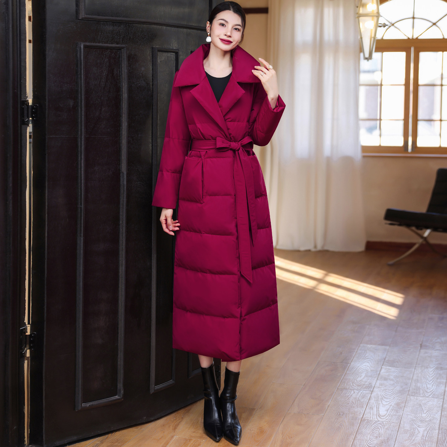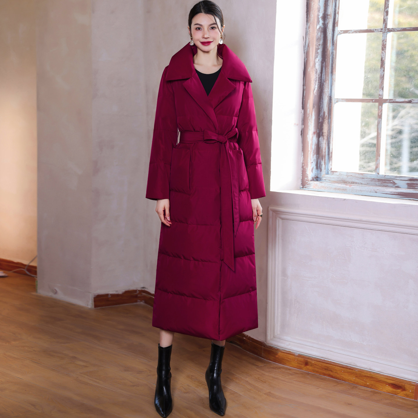 冬季高档大牌显瘦过膝外套长款保暖加厚修身酒红色西装领羽绒服女