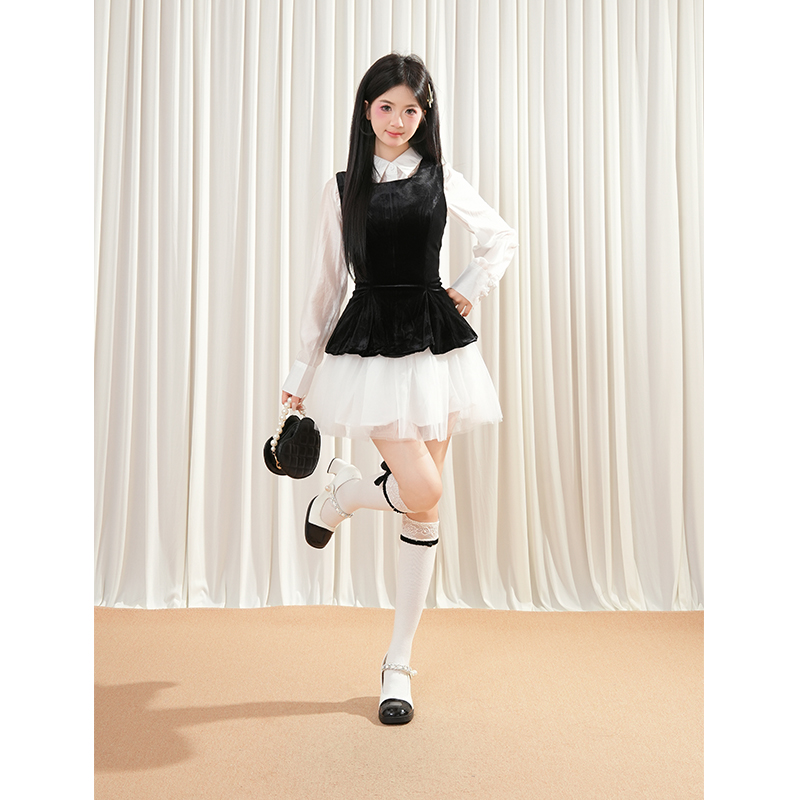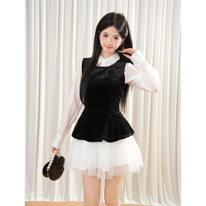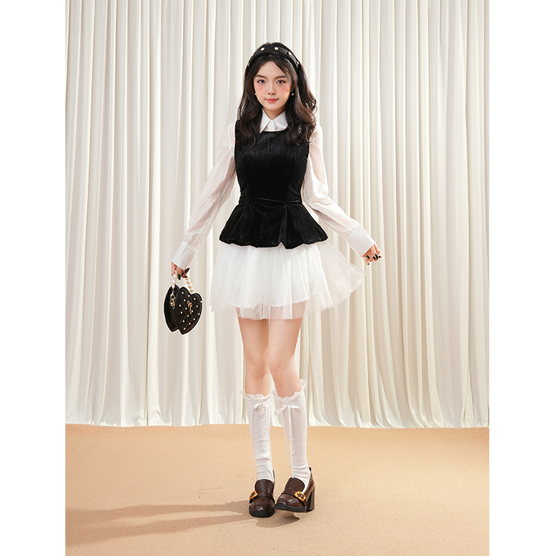 法式富家千金风套装女春季2025新款衬衫+网纱短裙+黑色上衣三件套