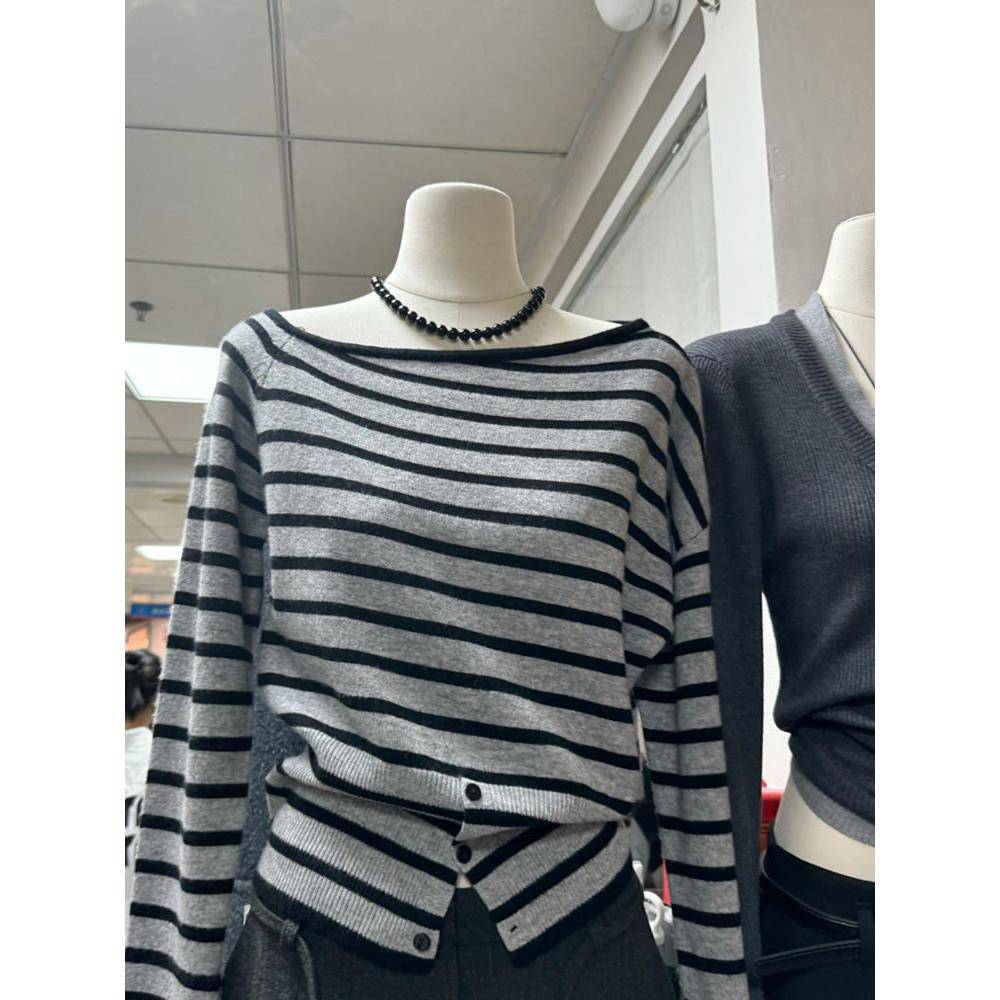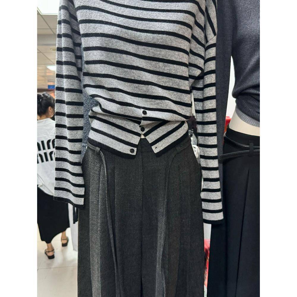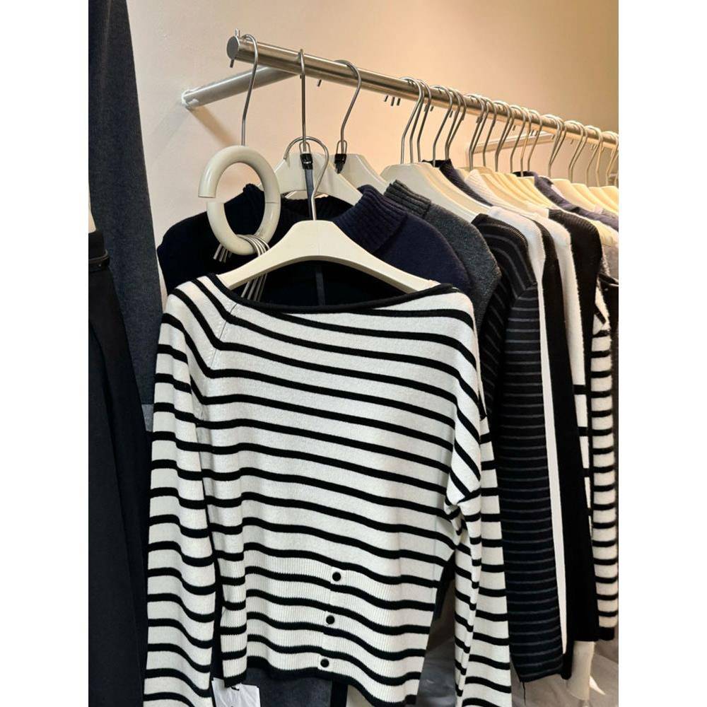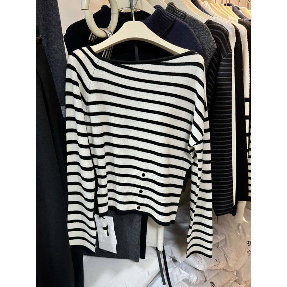 法式条纹不规则开叉针织T恤女秋季软糯毛衣下摆纽扣收腰小众上衣