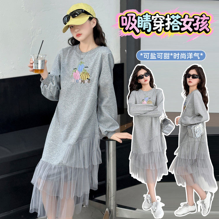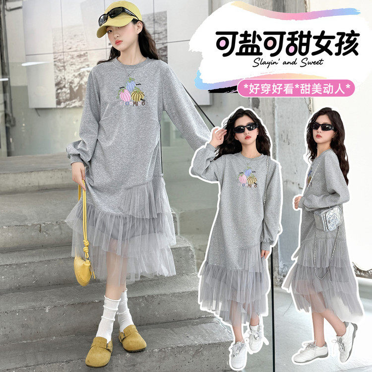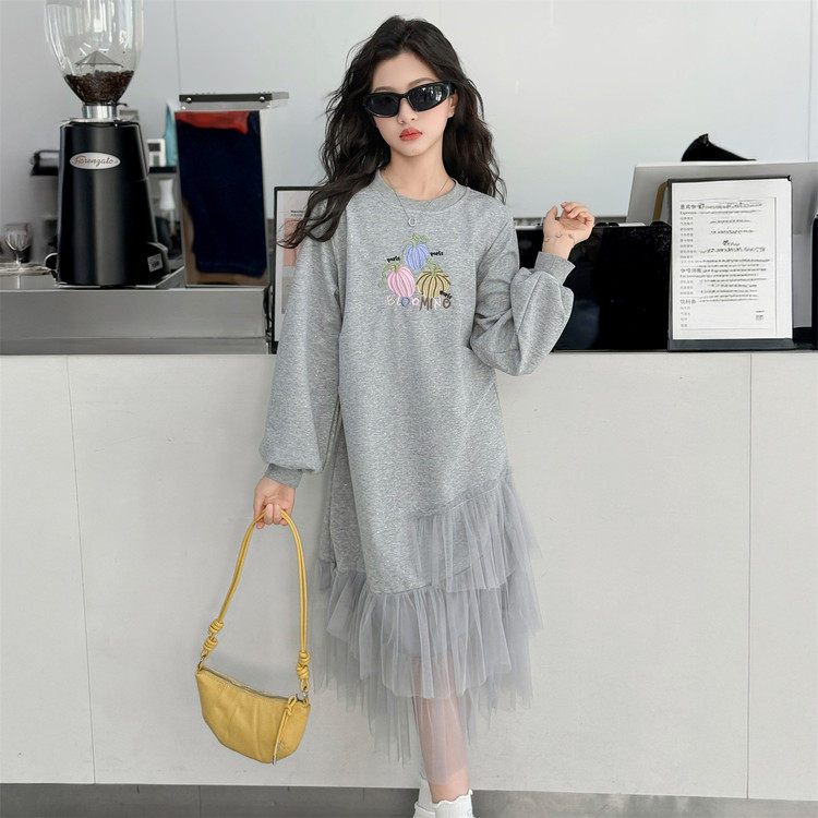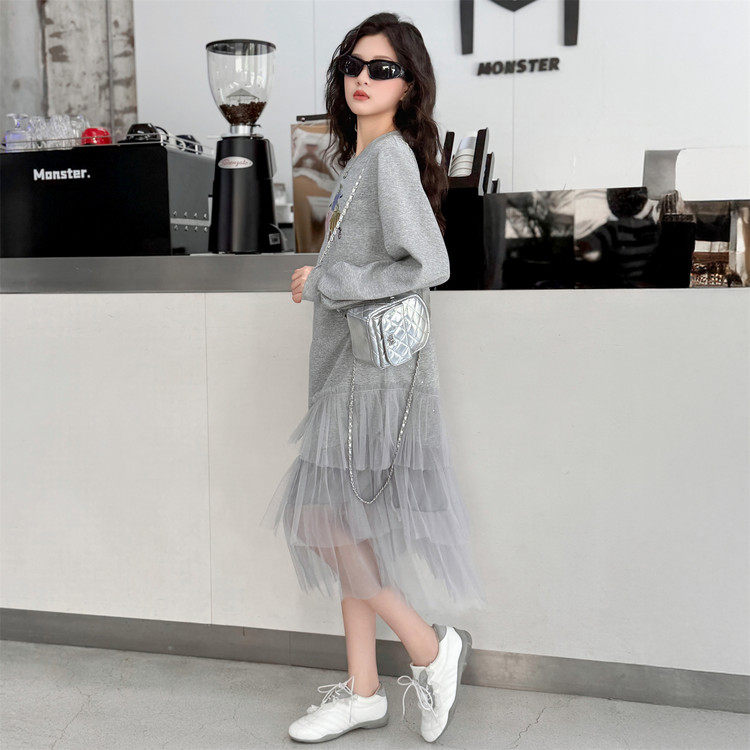 甜美风灰色长袖连衣裙女网纱拼接中长裙减龄显瘦小个子