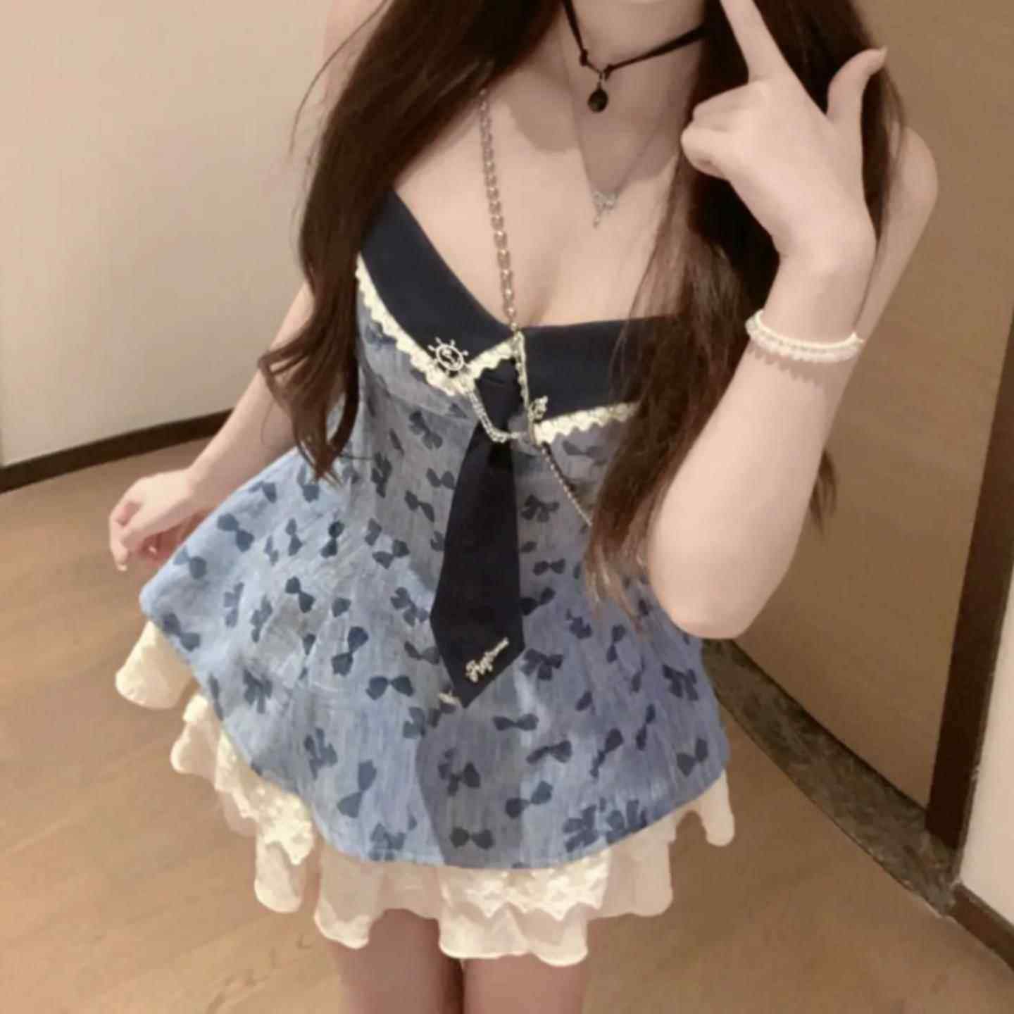 纯欲风甜美短裙夏季收腰显瘦设计感撞色蕾丝拼接印花吊带洋装女