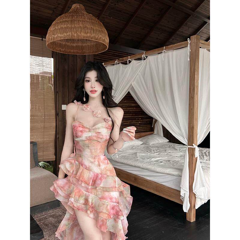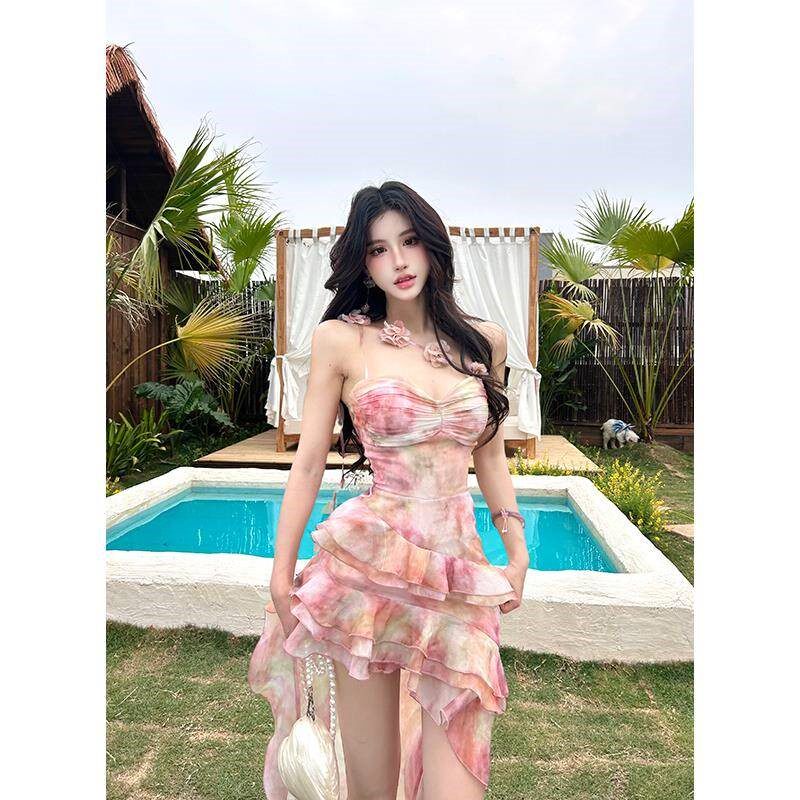 灰尘邓邓 度假风连衣裙女2025春季新款不规则荷叶边短裙抹胸裙子