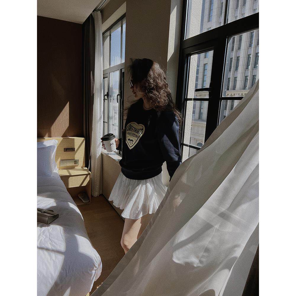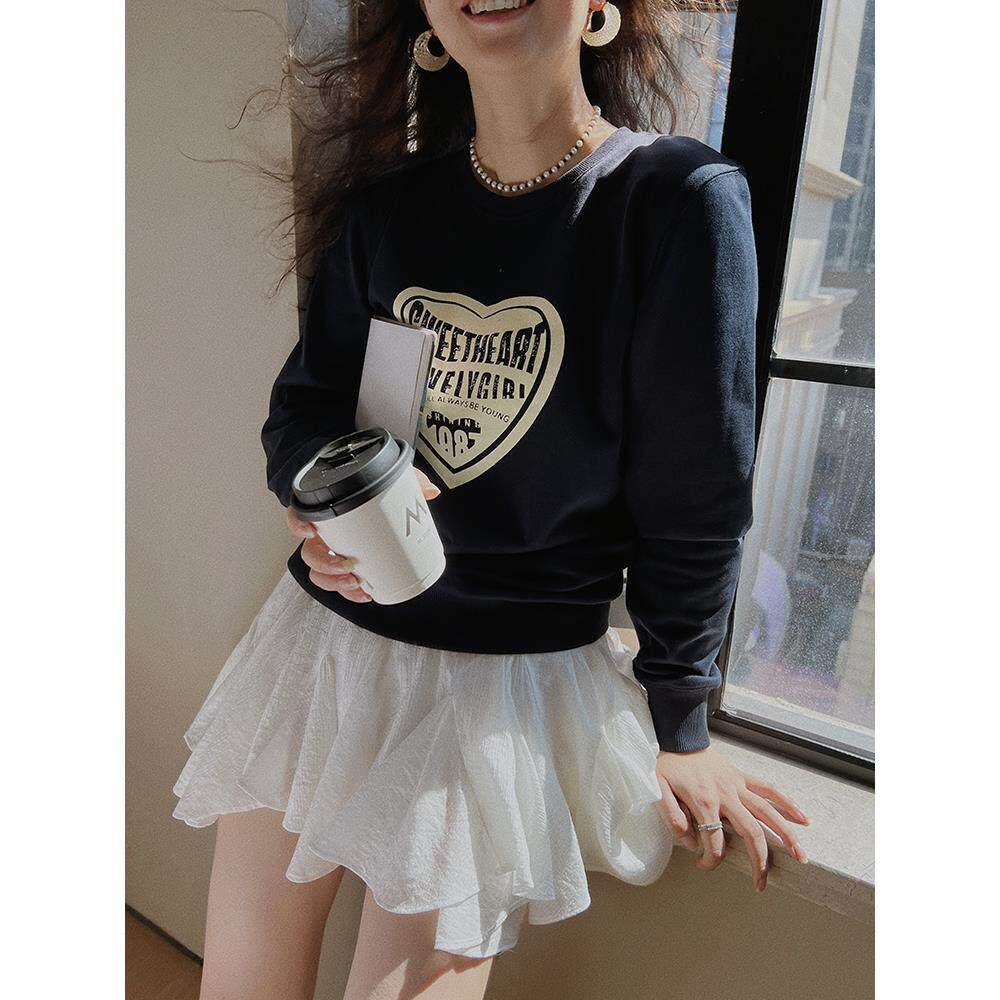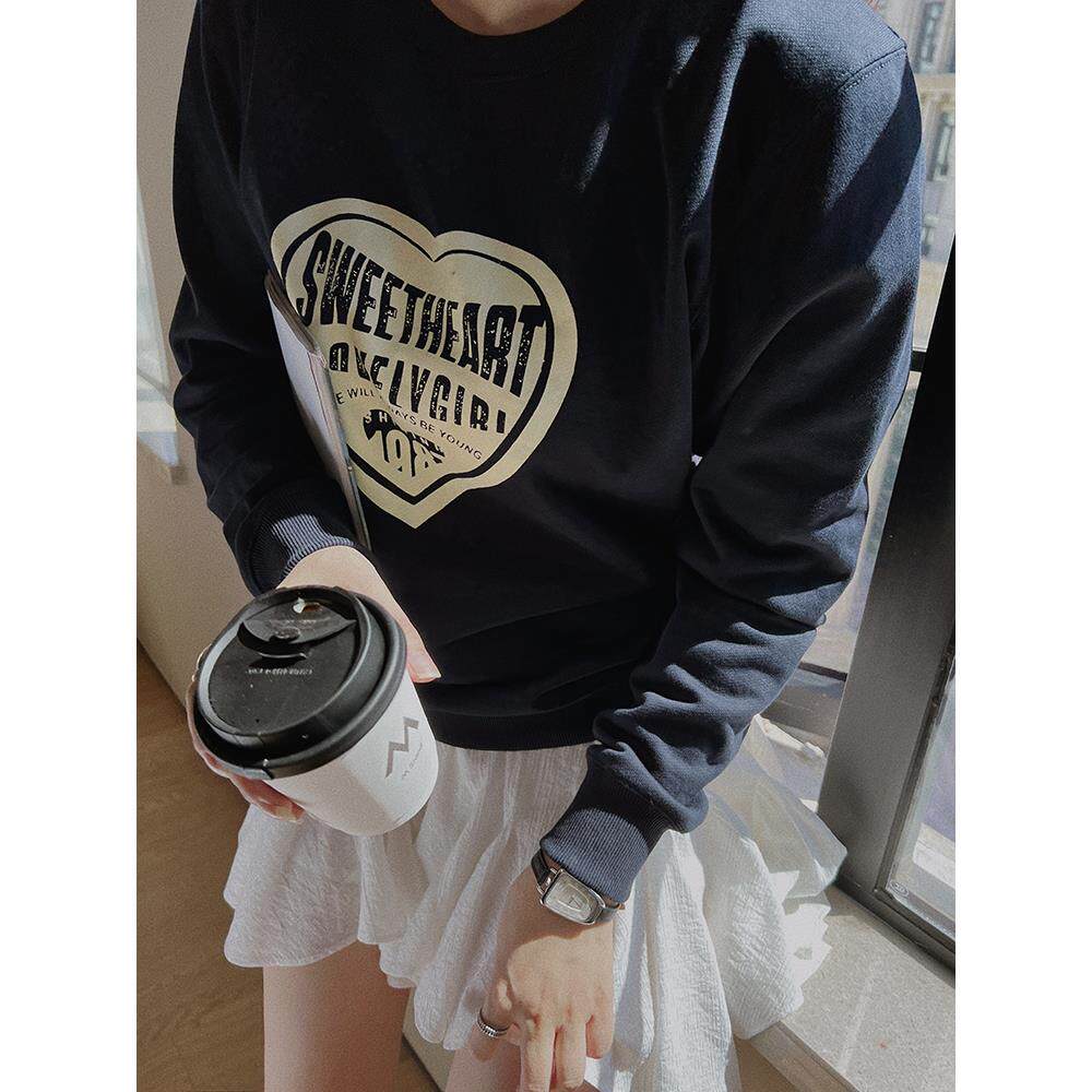 TOP家时髦休闲 法式复古画报印花落肩纯棉圆领宽松卫衣女2023秋冬